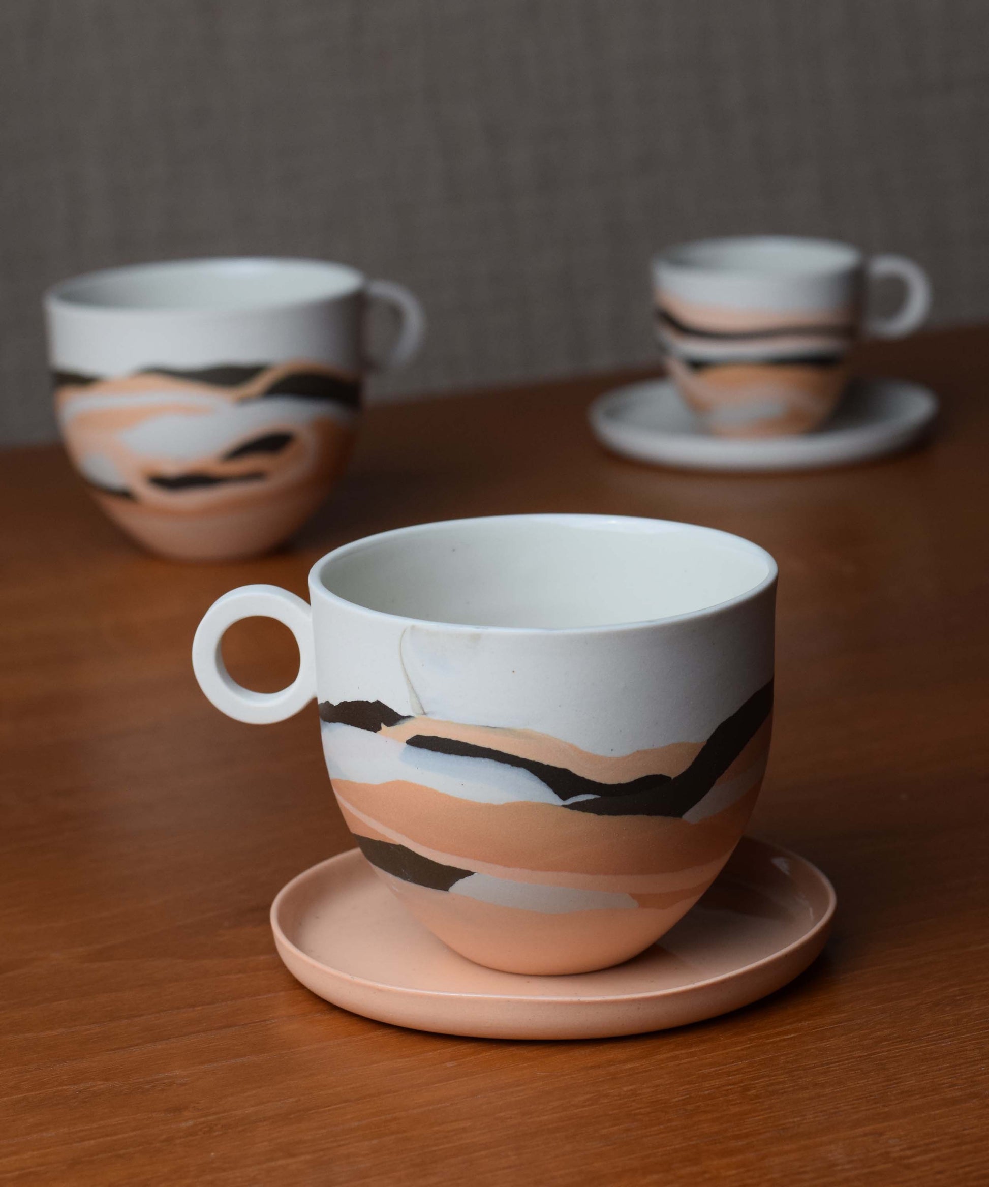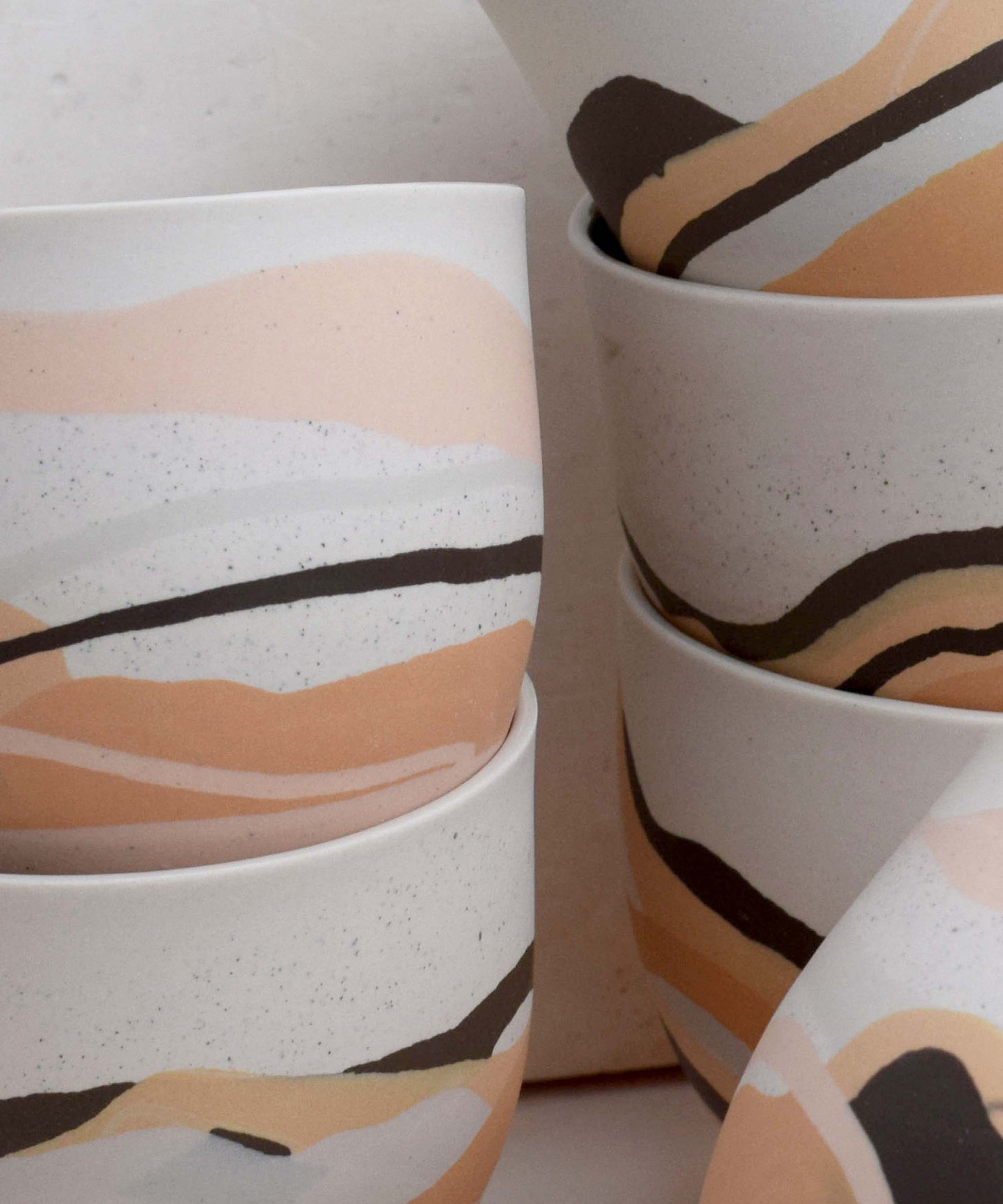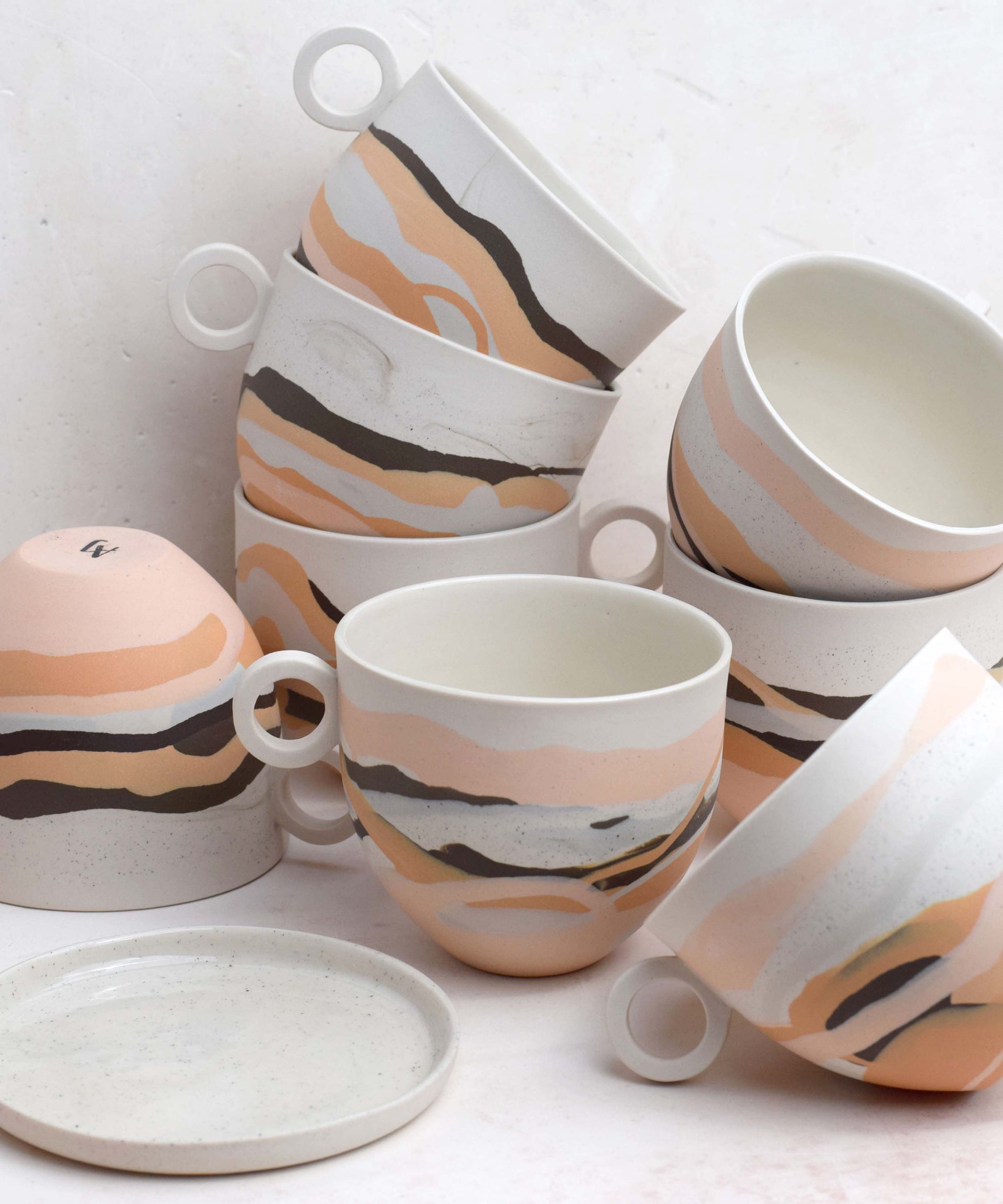 Each piece has distinct markings, ensuring it is truly one-of-a-kind. Created in small batches, the colours are skilfully composed from recycled porcelain clay remnants. This waste clay, a by-product of slip casting, has been thoughtfully collected and repurposed in these innovative designs, promoting sustainability and reducing waste.