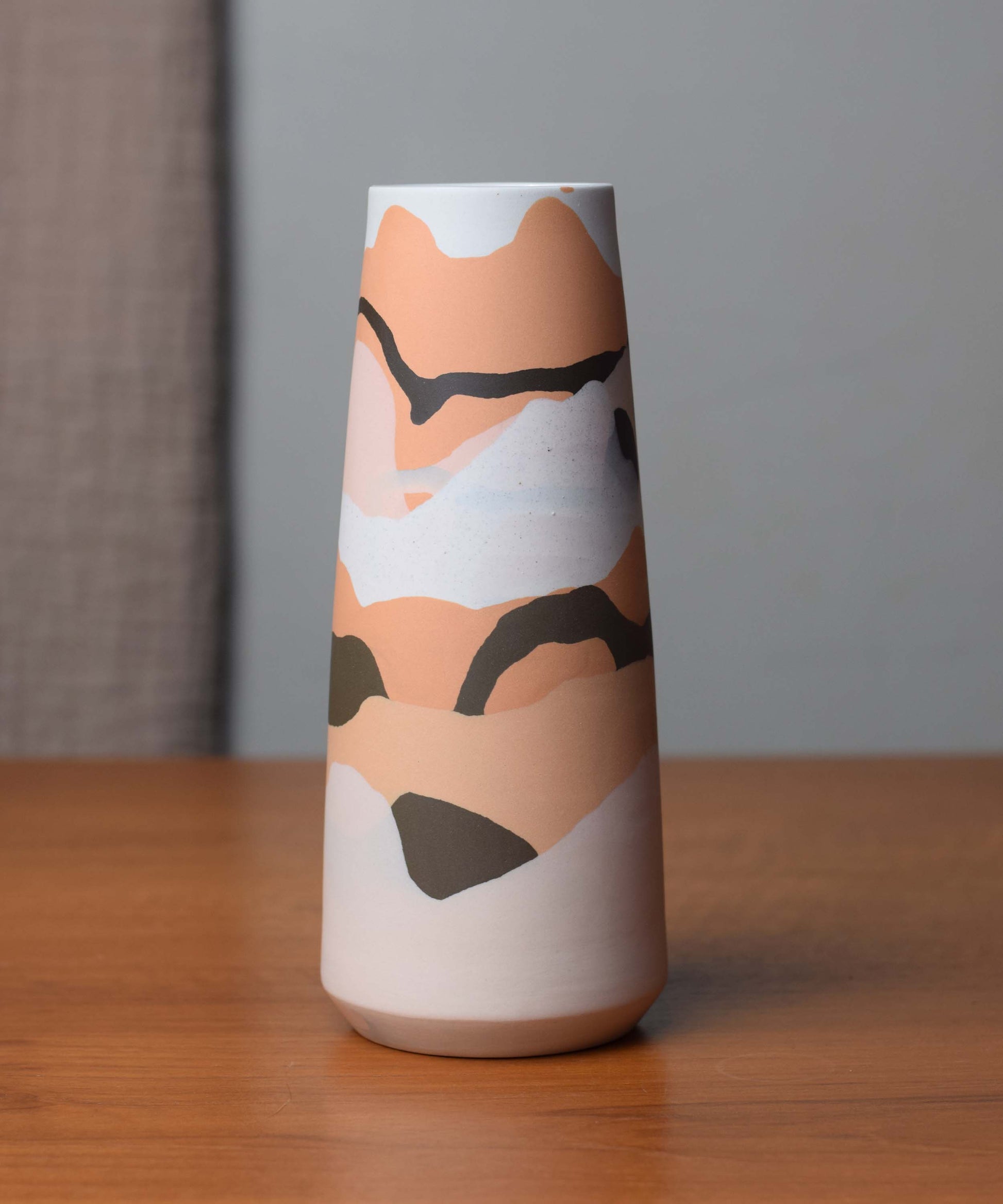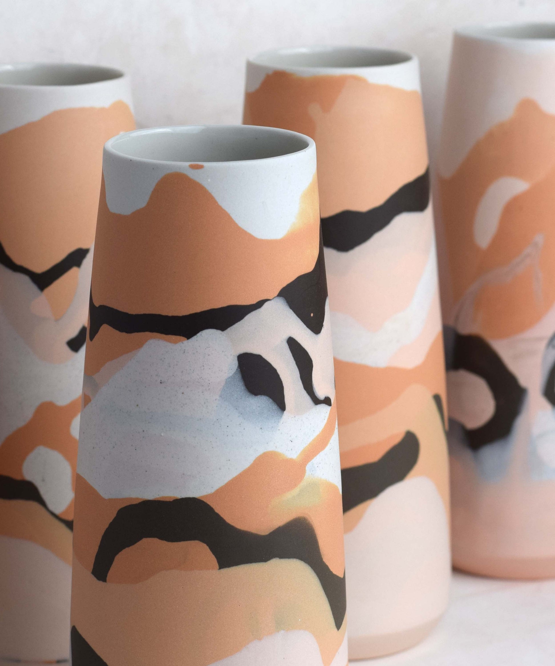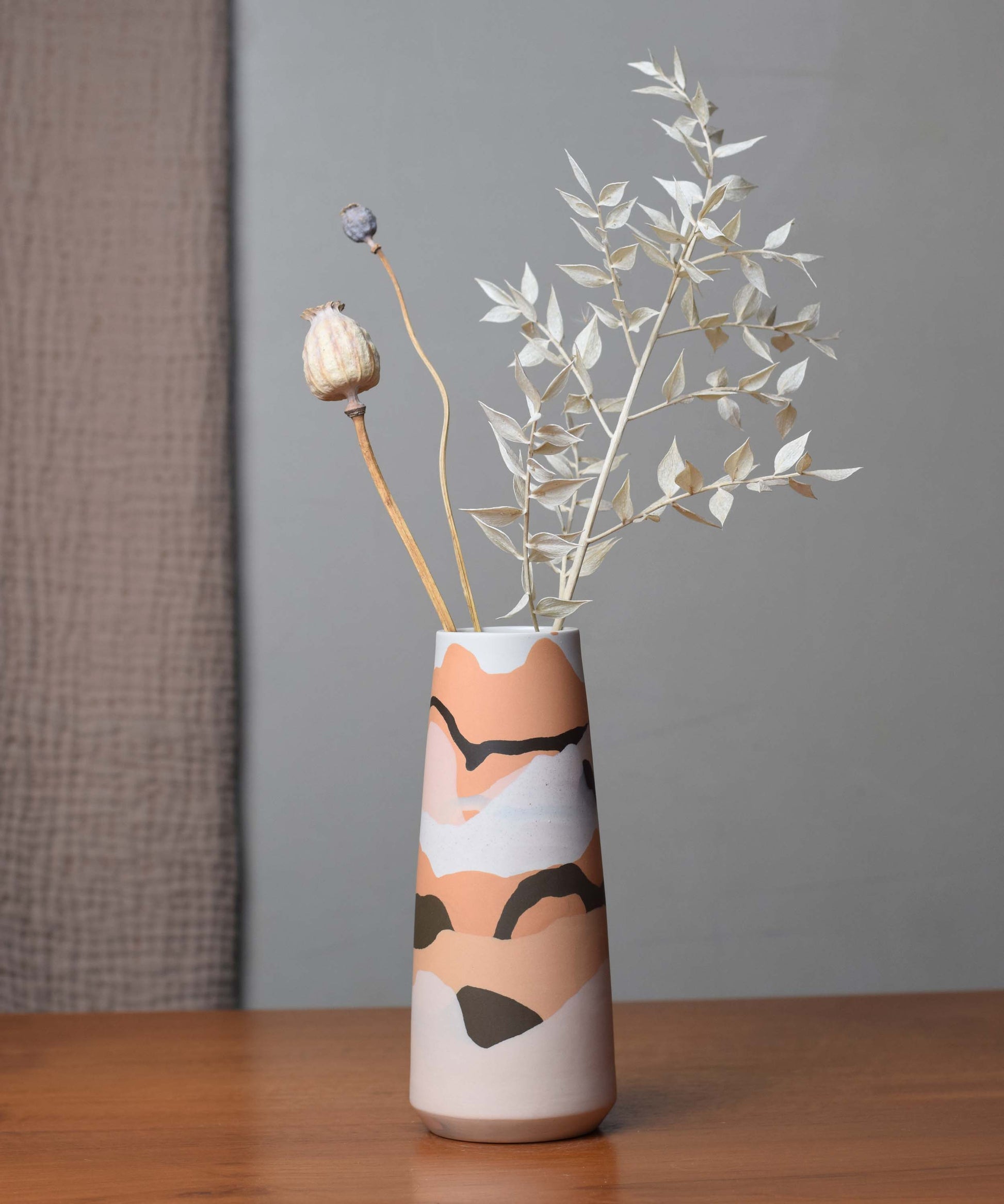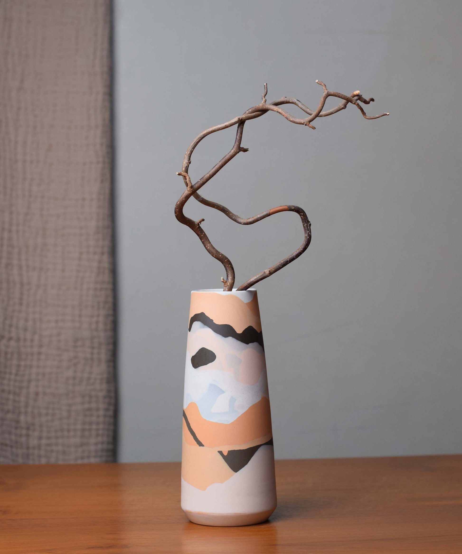 Each Vase in this collection is truly one-of-a-kind. Created in small batches, the colours are skilfully composed from recycled porcelain clay remnants. This waste clay, a by-product of slip casting, has been thoughtfully collected and repurposed in these innovative designs, promoting sustainability and reducing waste.