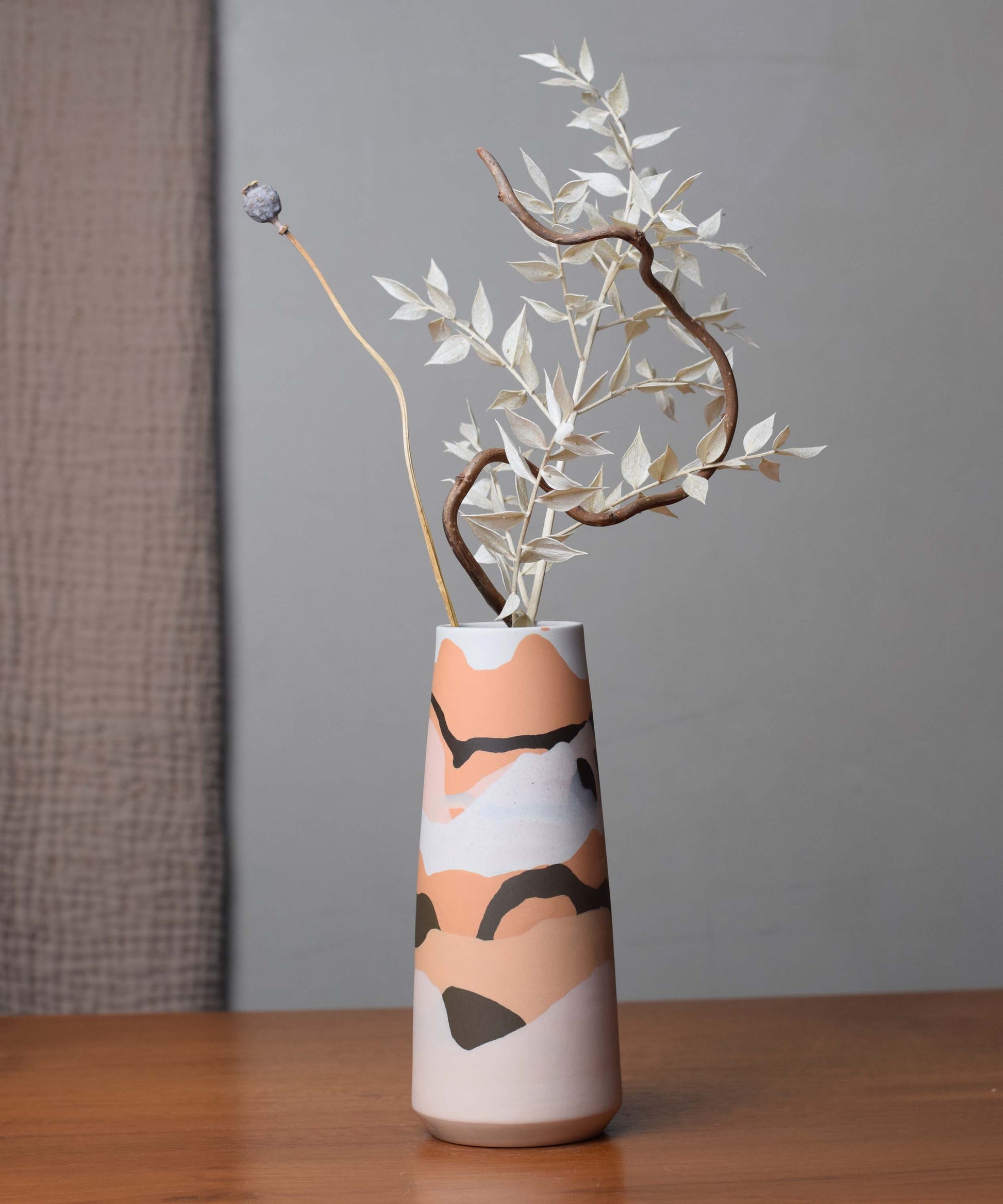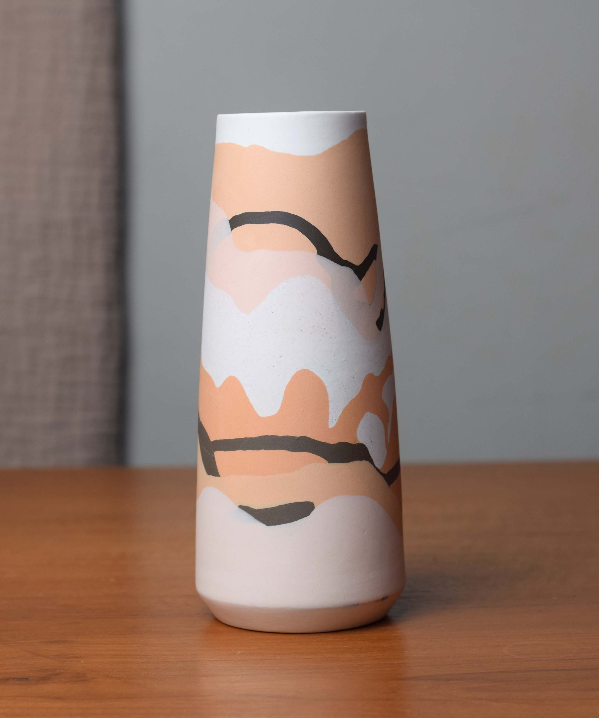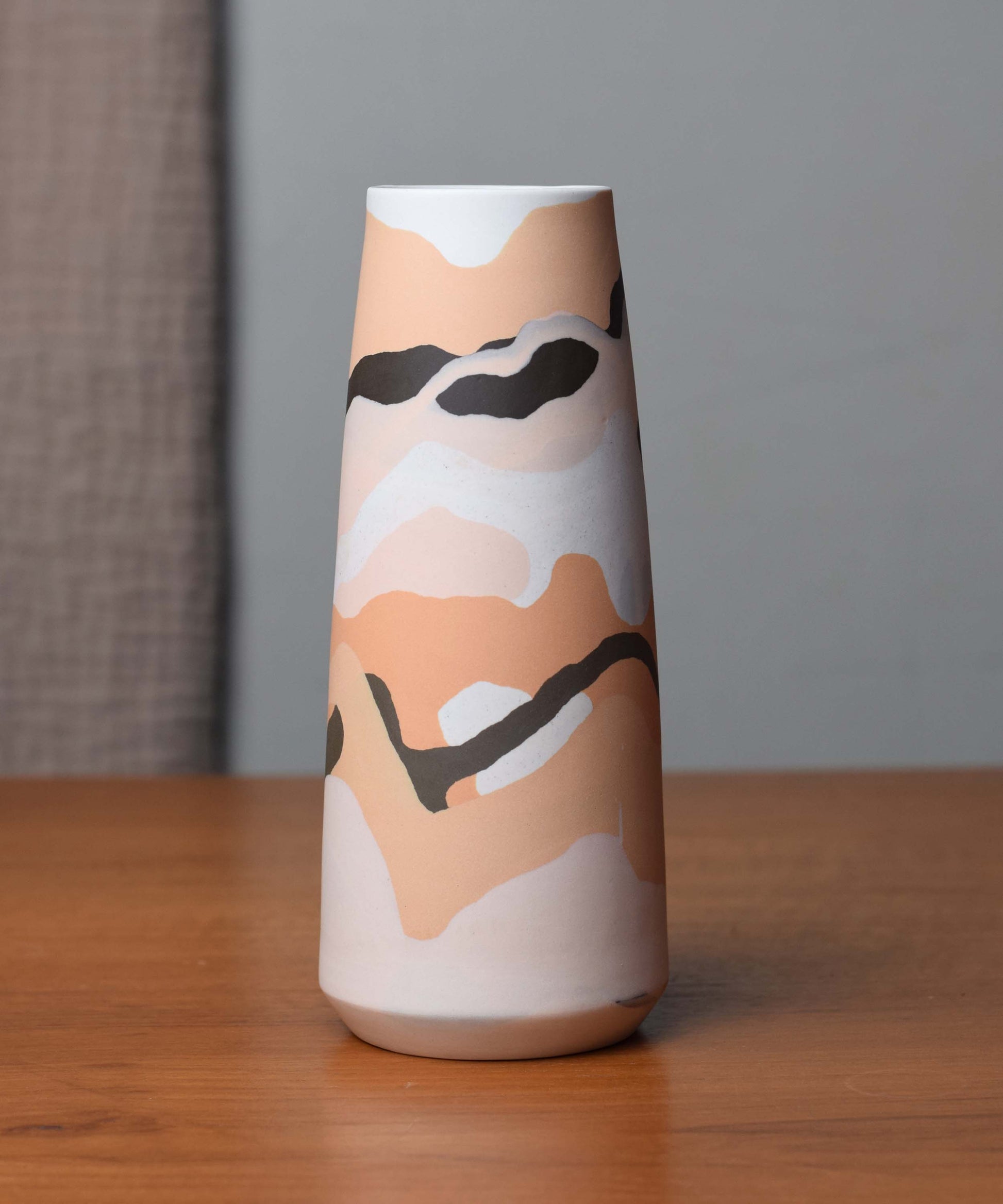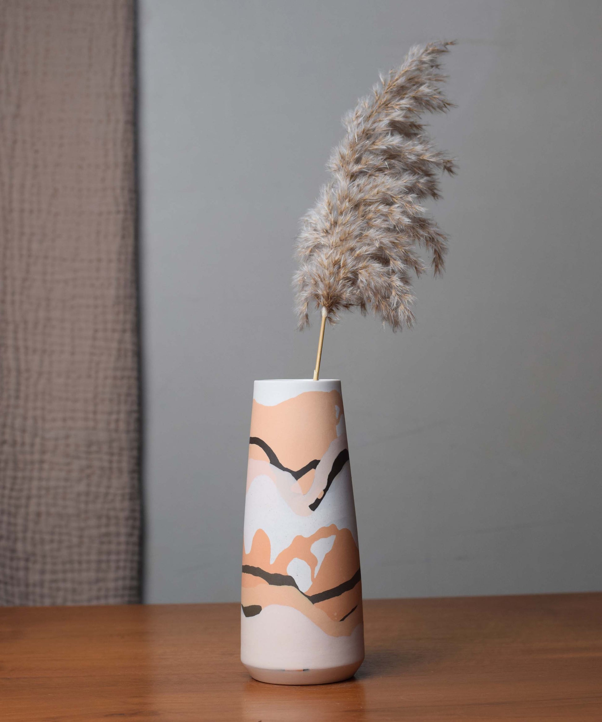 Each Vase in this collection is truly one-of-a-kind. Created in small batches, the colours are skilfully composed from recycled porcelain clay remnants. This waste clay, a by-product of slip casting, has been thoughtfully collected and repurposed in these innovative designs, promoting sustainability and reducing waste.