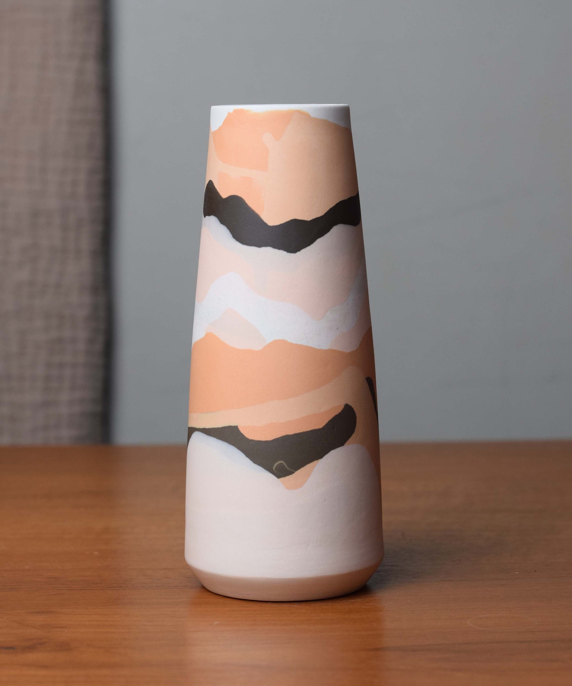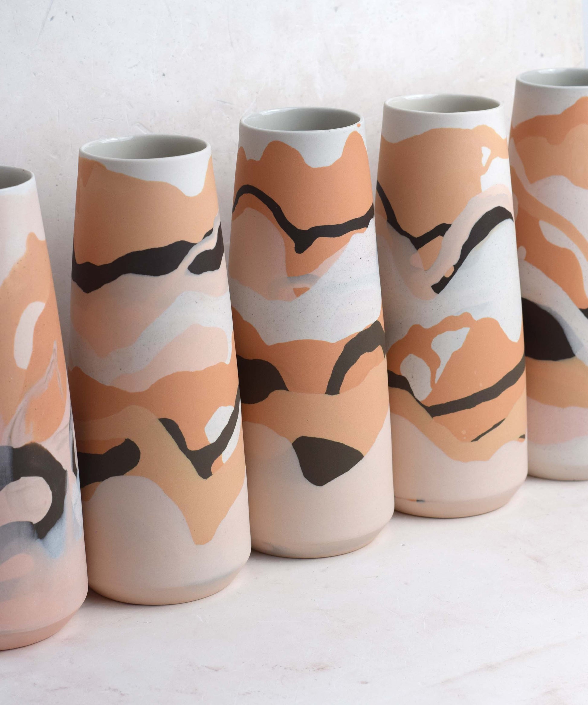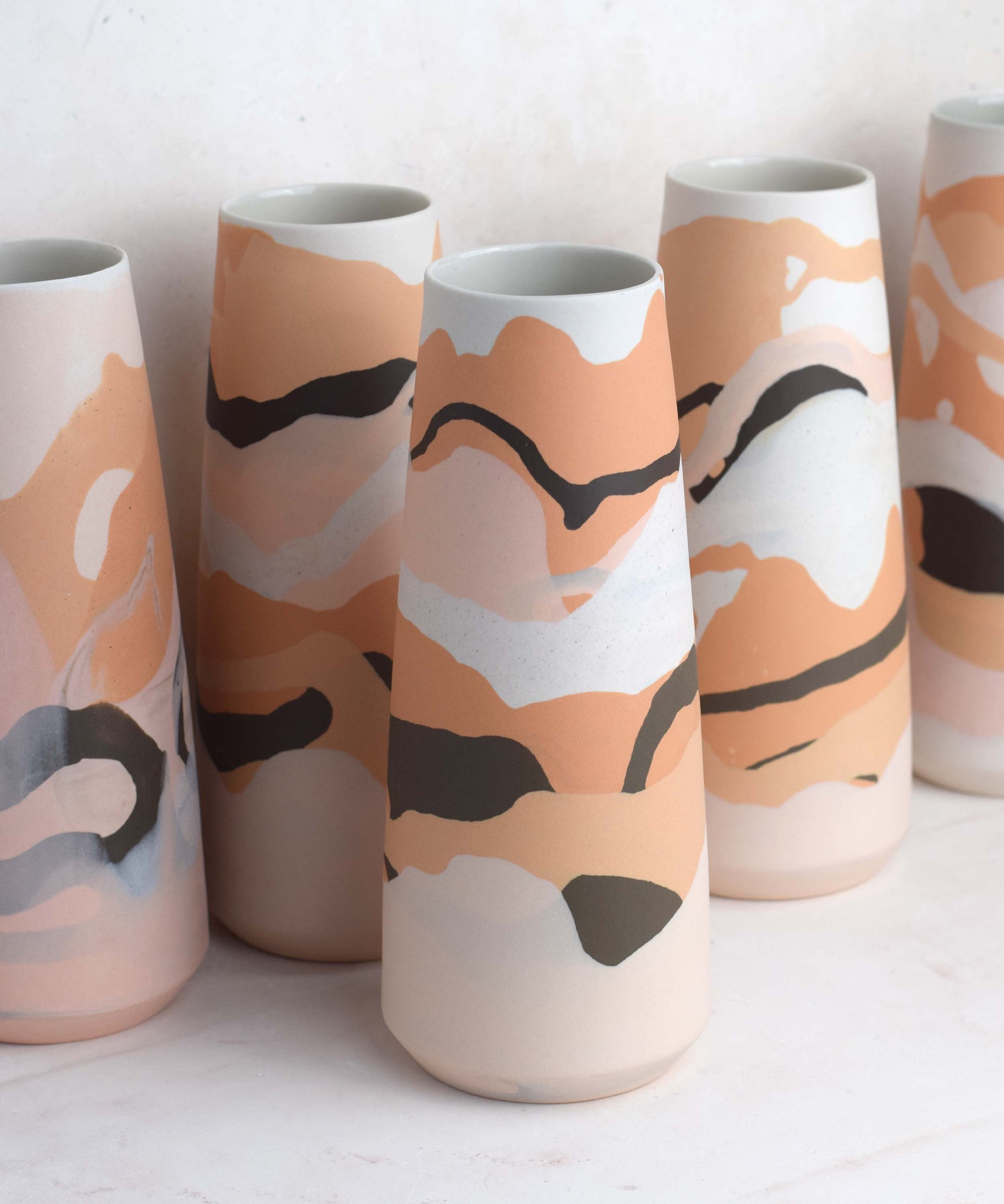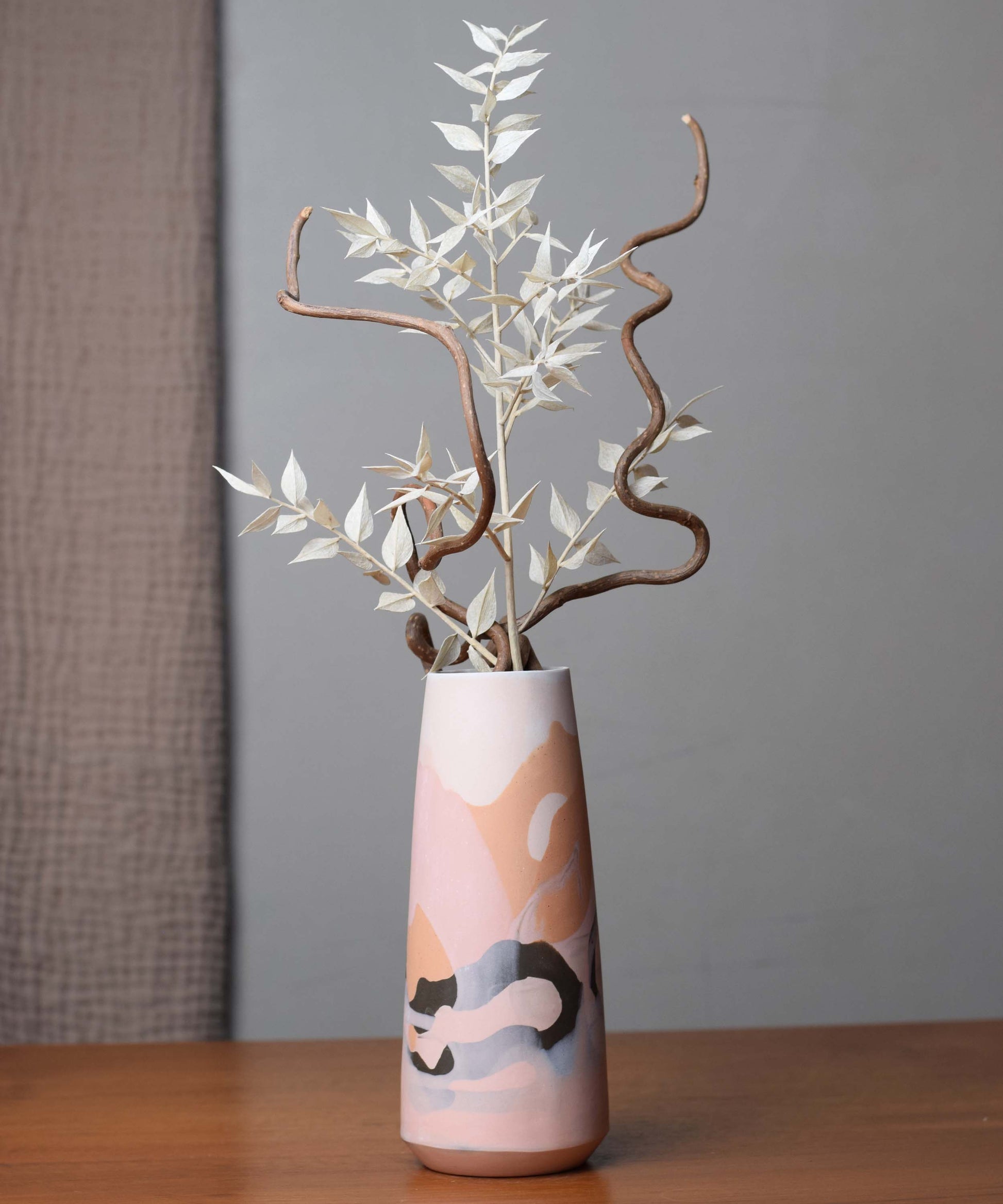 Each Vase in this collection is truly one-of-a-kind. Created in small batches, the colours are skilfully composed from recycled porcelain clay remnants. This waste clay, a by-product of slip casting, has been thoughtfully collected and repurposed in these innovative designs, promoting sustainability and reducing waste.