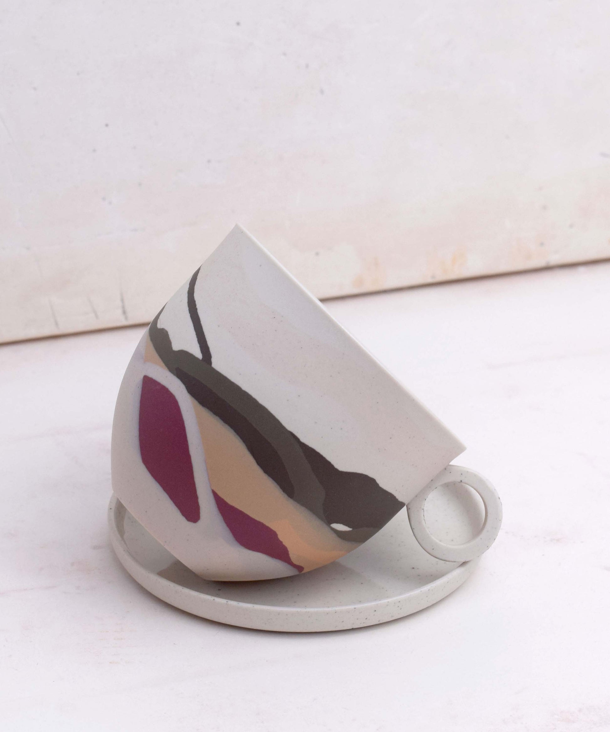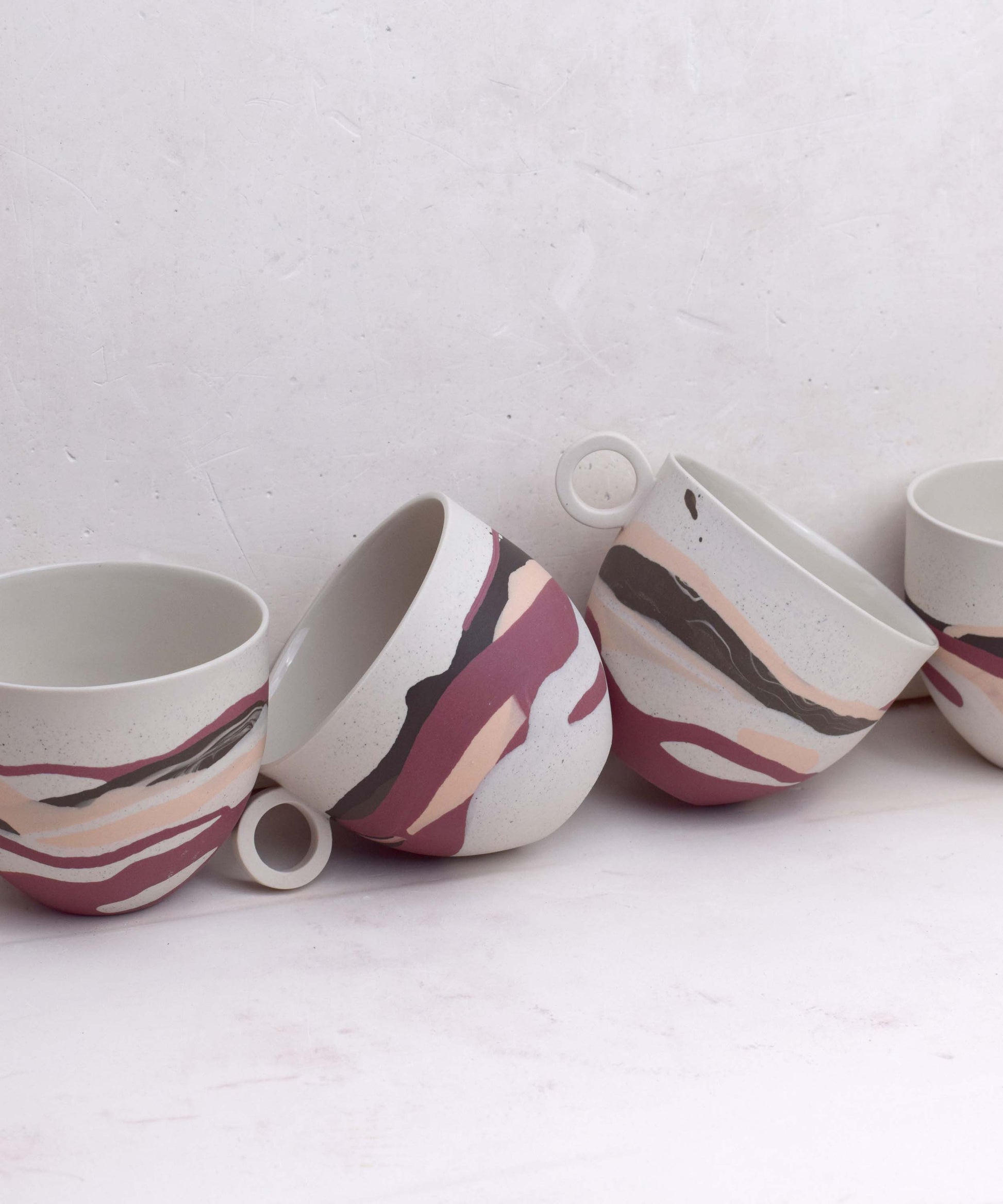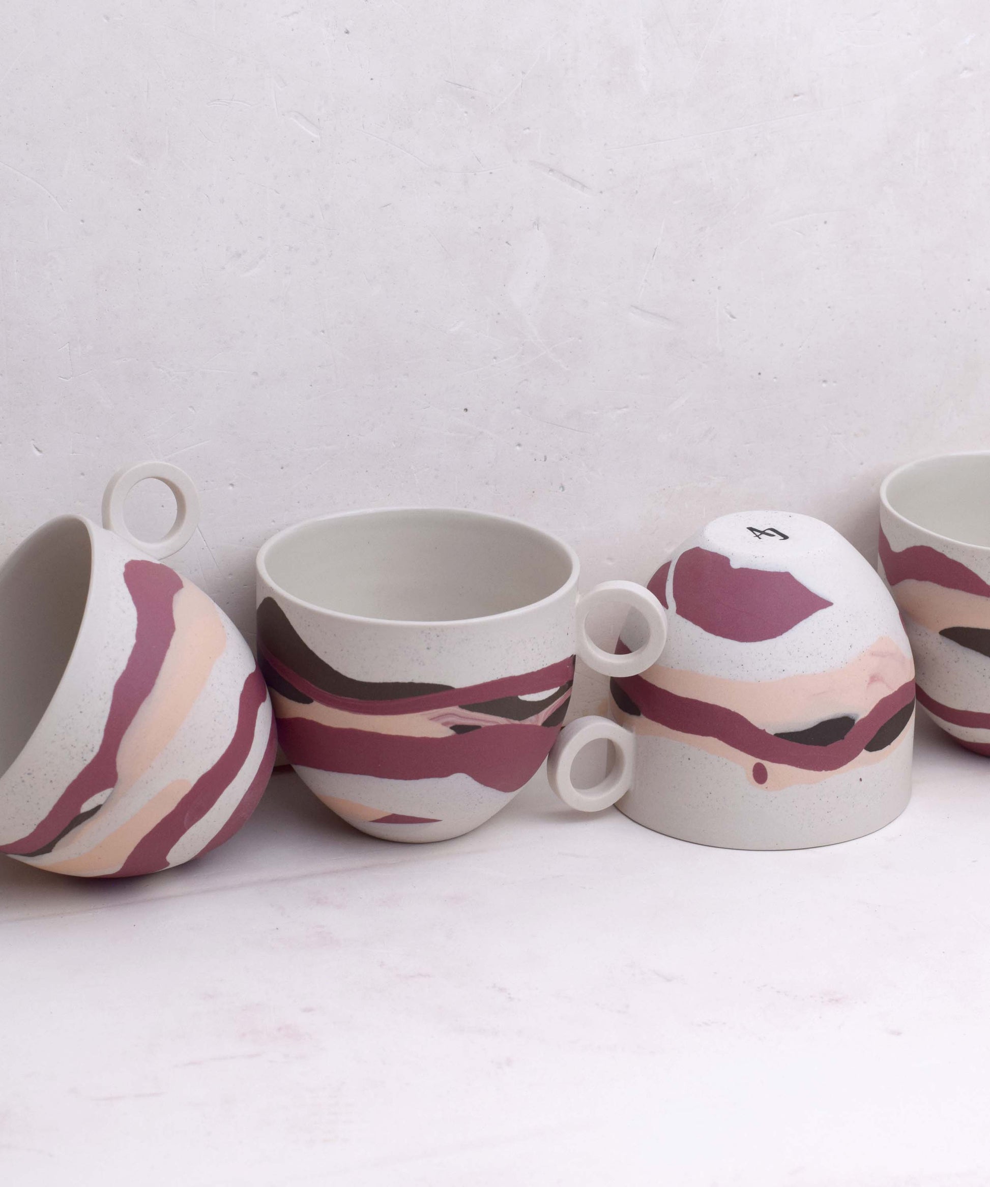 Each piece has distinct markings, ensuring it is truly one-of-a-kind. Created in small batches, the colours are skilfully composed from recycled porcelain clay remnants. This waste clay, a by-product of slip casting, has been thoughtfully collected and repurposed in these innovative designs, promoting sustainability and reducing waste.
