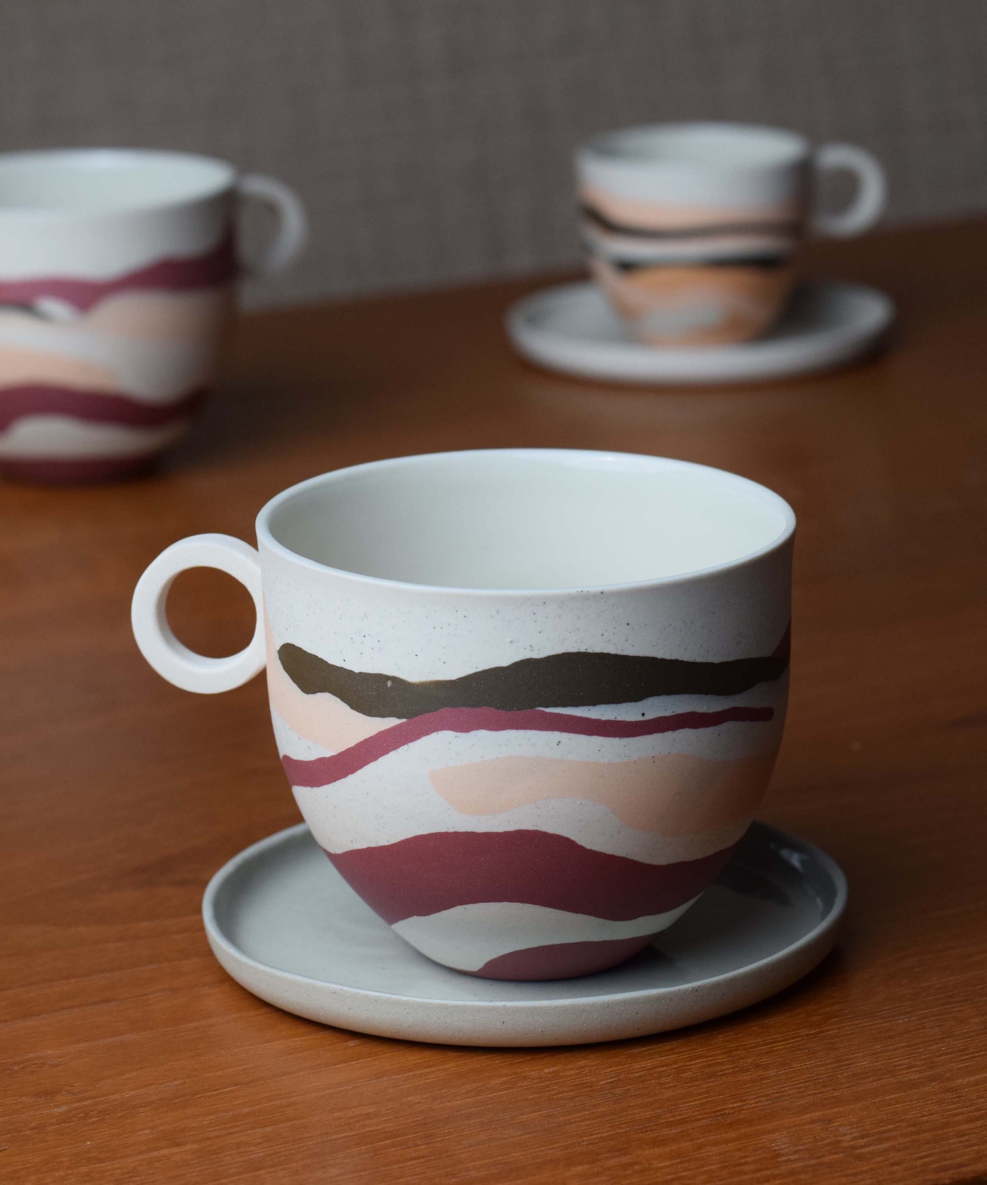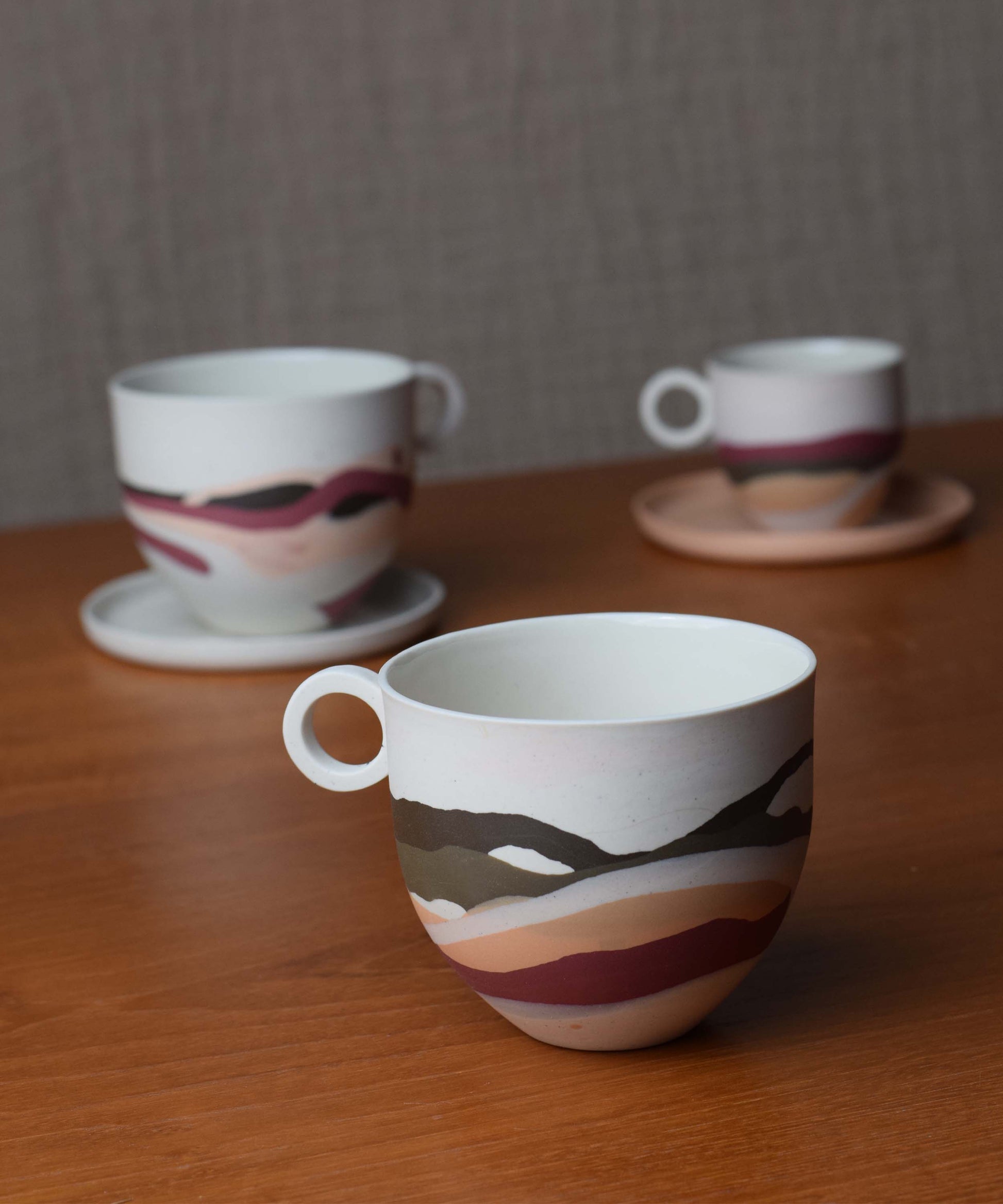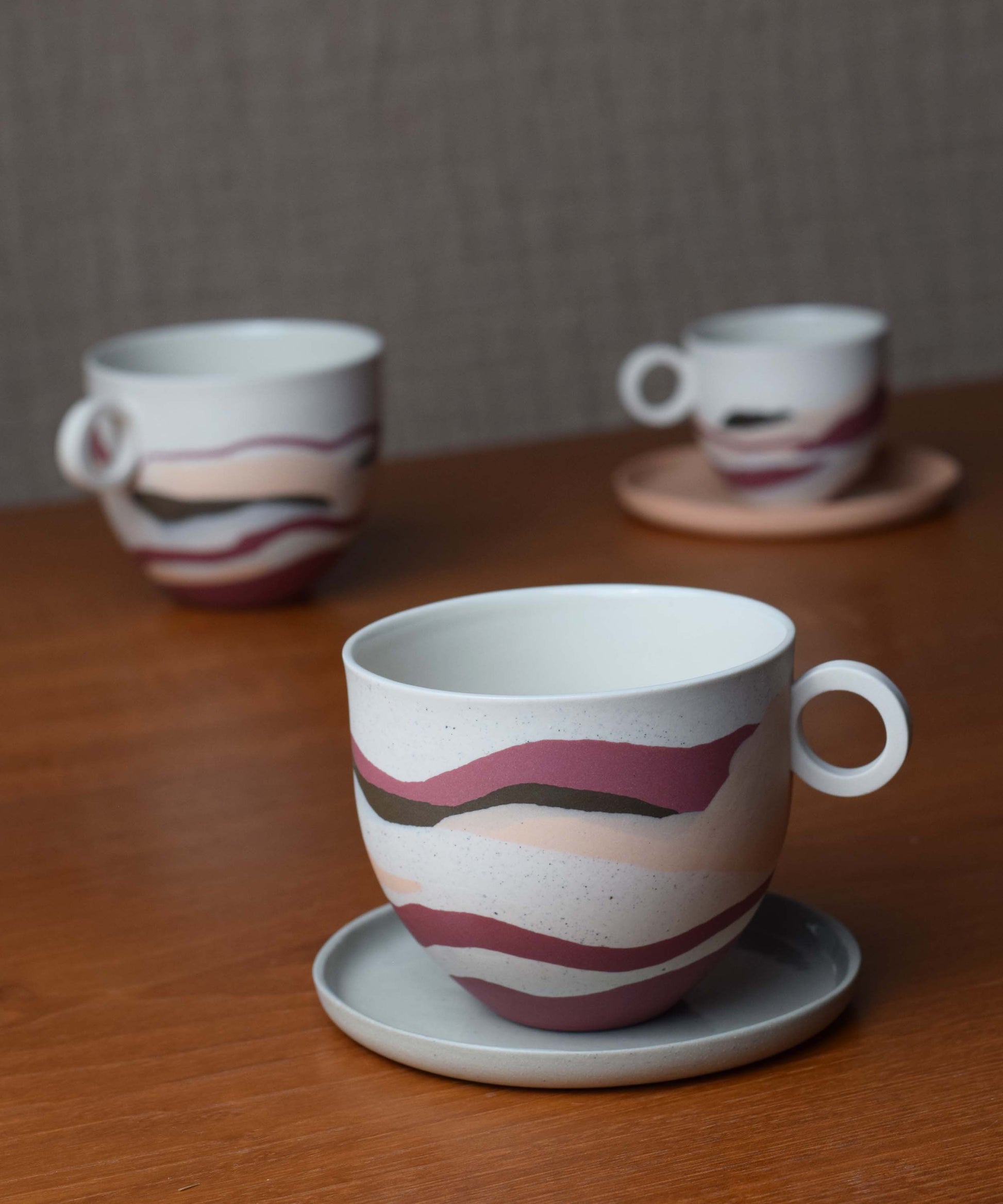 The mugs featured in the photographs represent the style. There are two variations within the Dune range; Terracotta Sands and Peach Sands. Due to the making process, each piece is individual and the shades of colours may vary slightly. Each piece is unique and can not be duplicated therefore a mug will be randomly selected from the edition and sent to you.