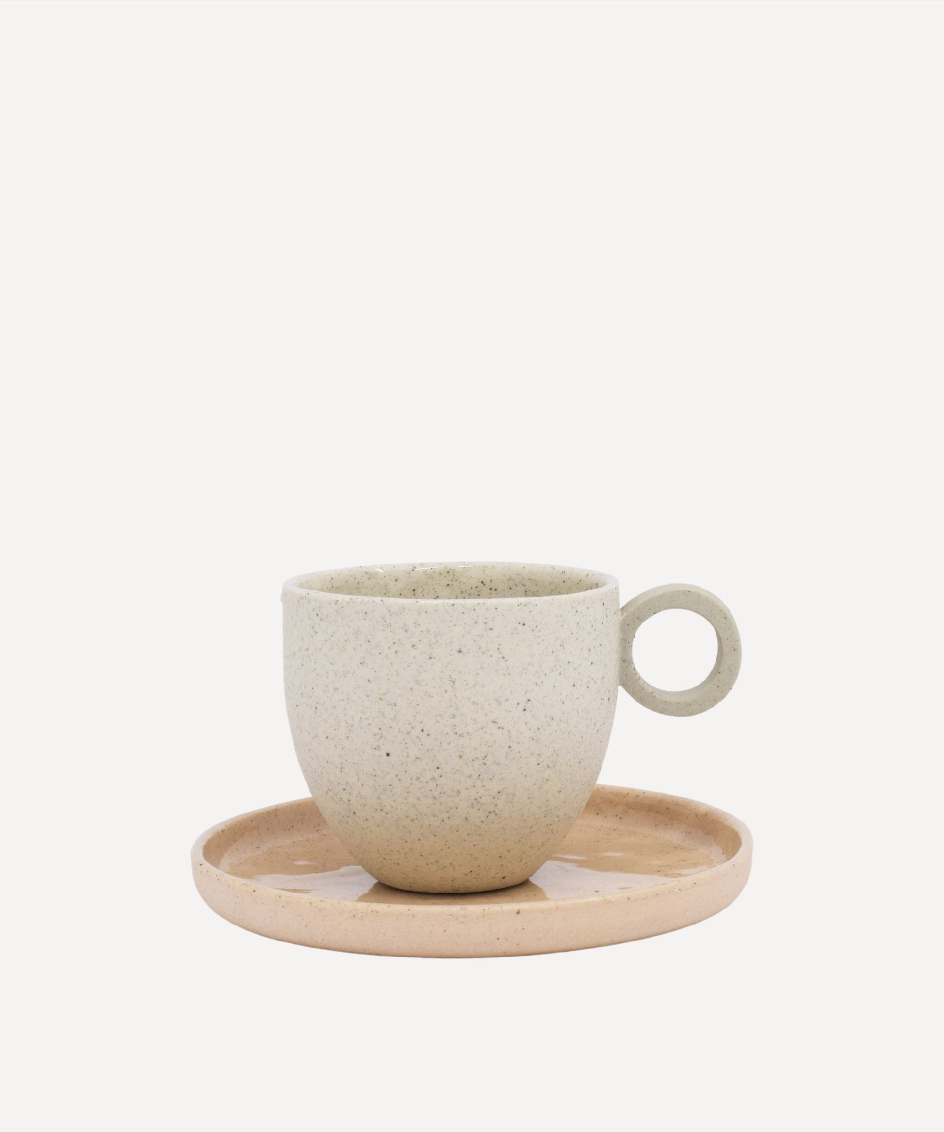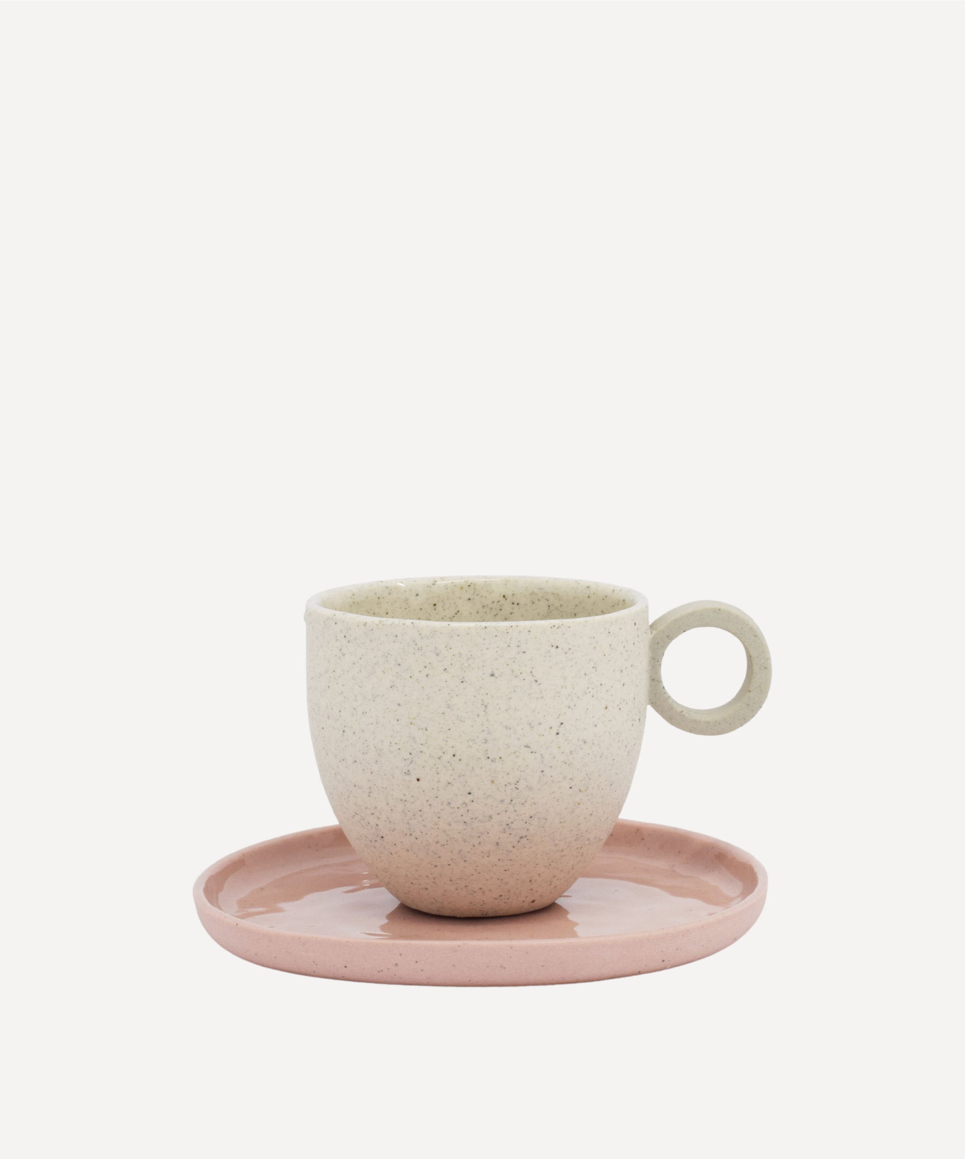 The espresso cup has been slip cast with slip containing iron which creates a beautiful speckle throughout. The outside of the cup has a smooth matt finish in contrast to a glossy inside, where a clear glaze has been applied for functionality.