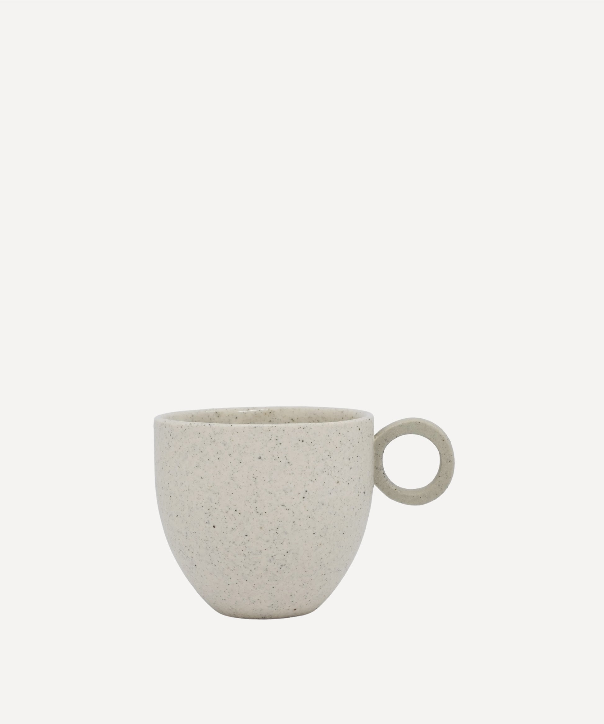 Speckled white porcelain espresso cup with contrasting ring handle.