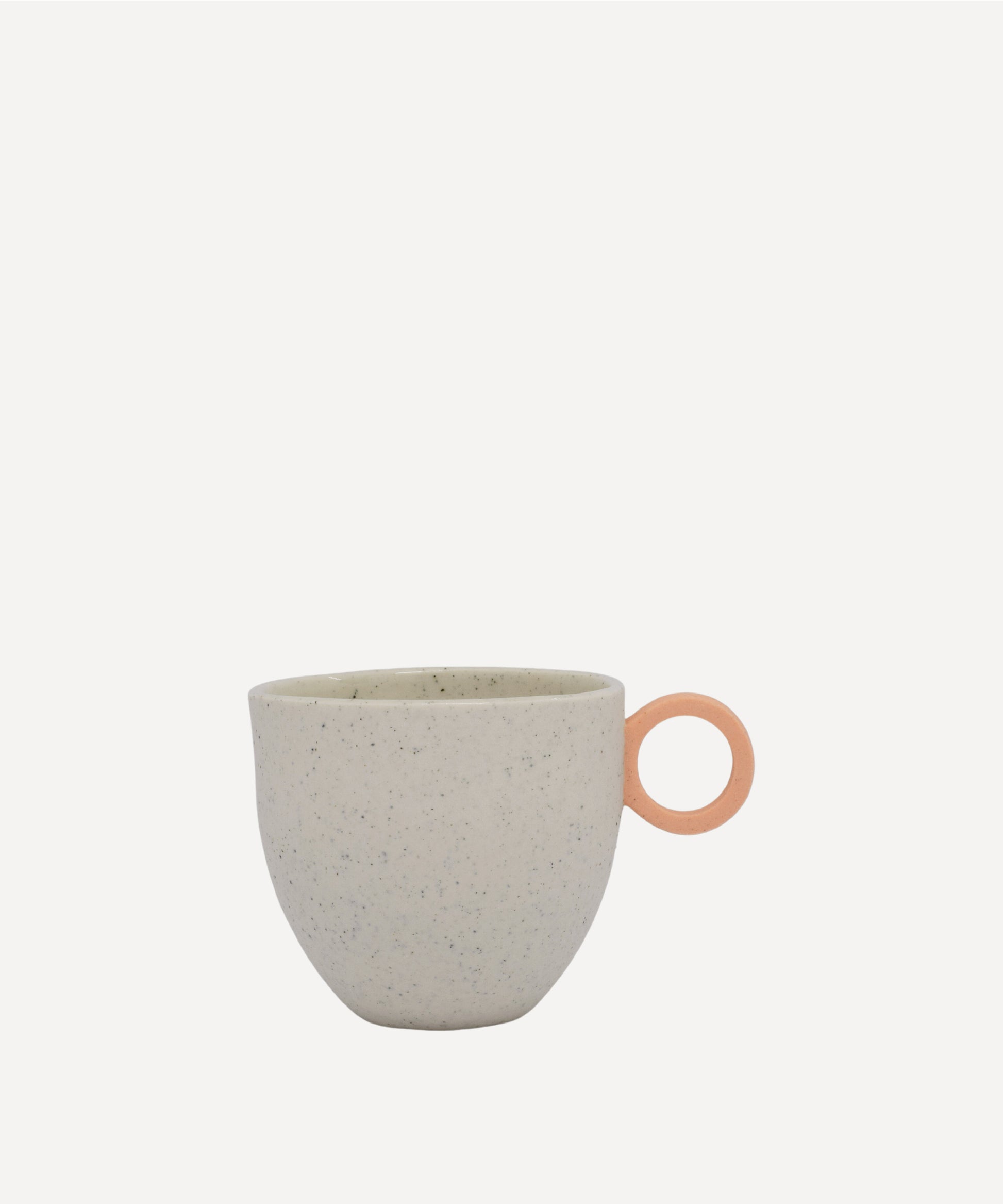 Speckled white porcelain espresso cup with contrasting ring handle.