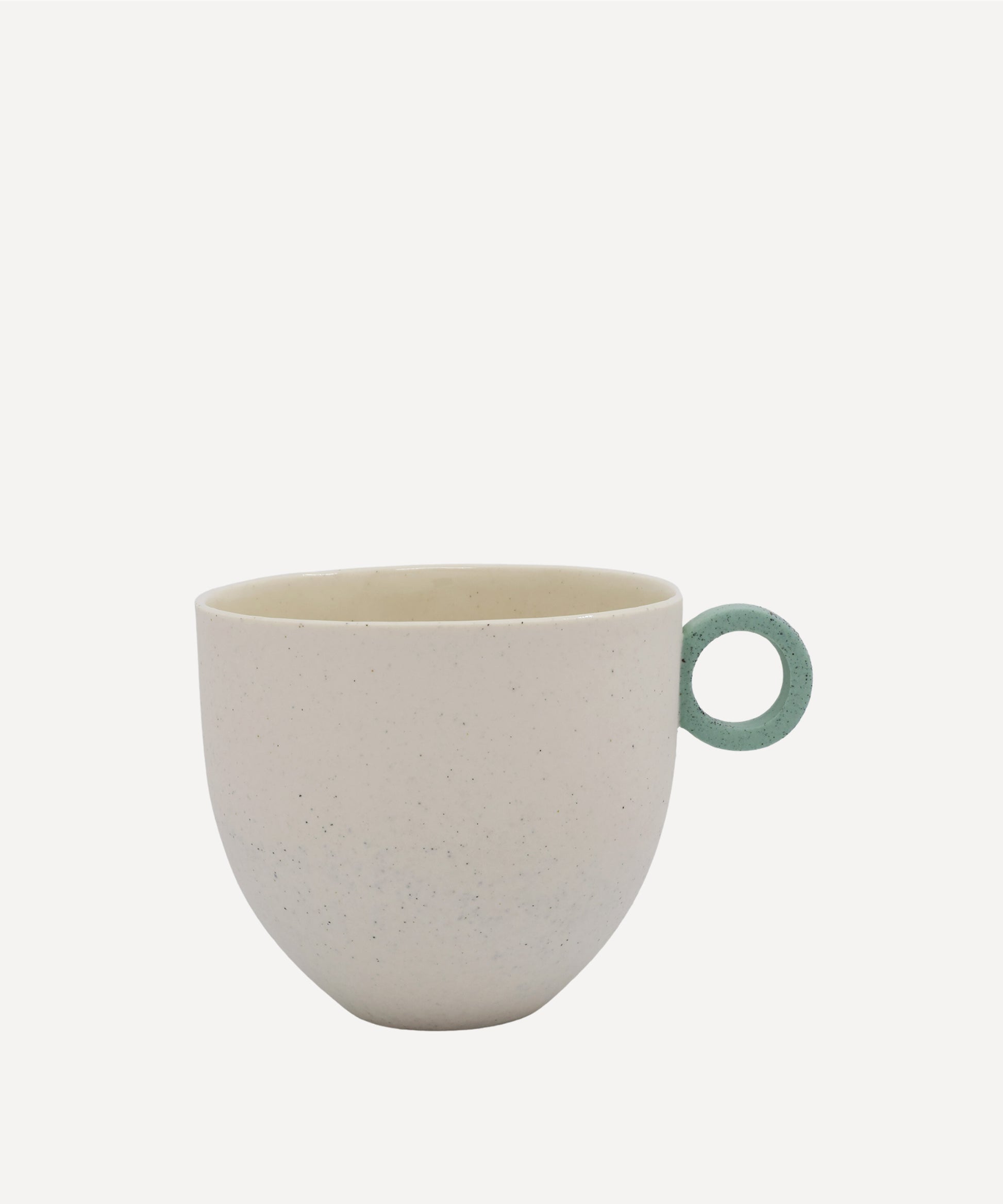 Speckled matt white porcelain mug with contrasting ring handle.