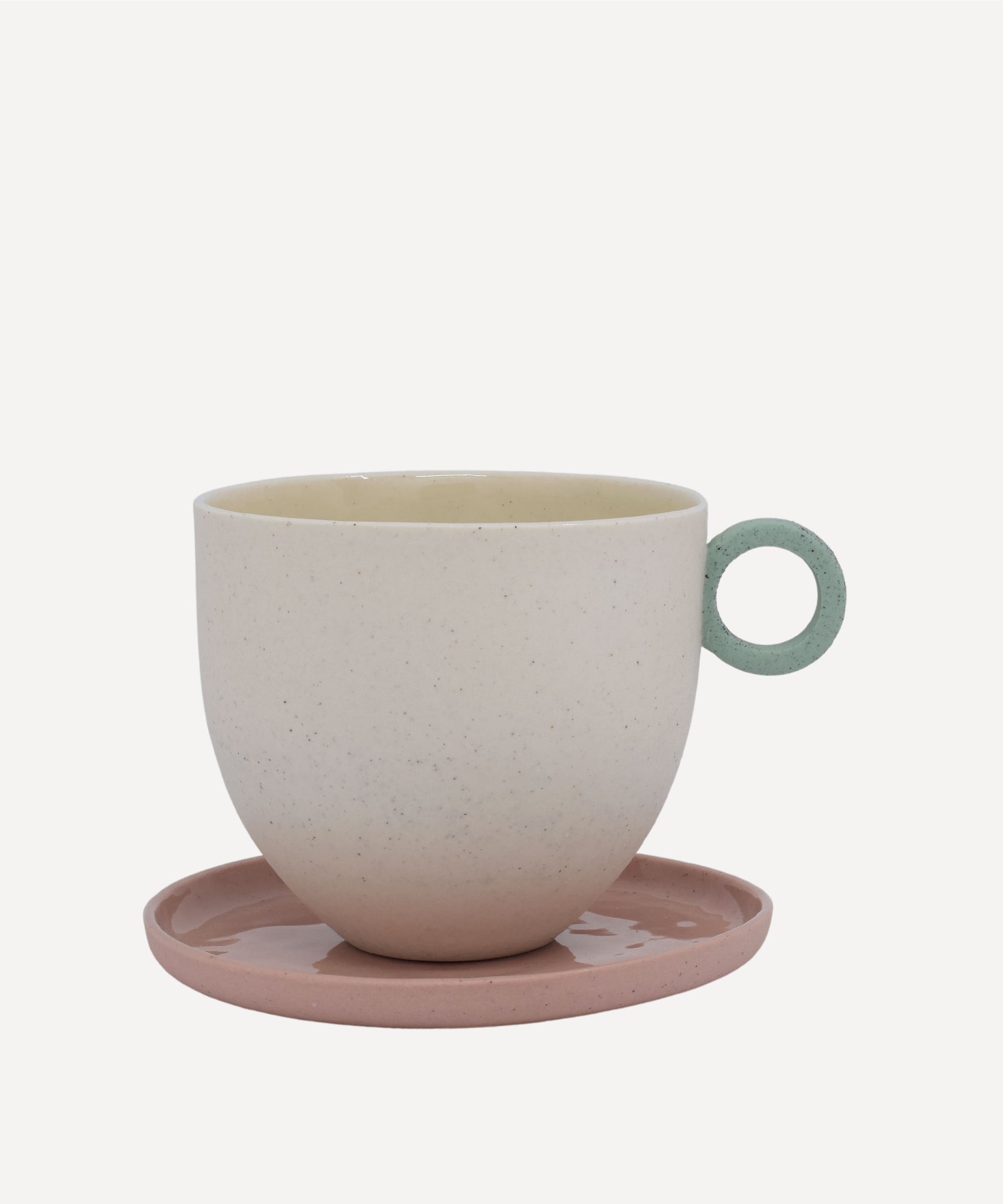 The mug has been slip cast with slip containing iron which creates a beautiful speckle throughout. The outside of the mug has a smooth matt finish in contrast to a glossy inside, where a clear glaze has been applied for functionality.