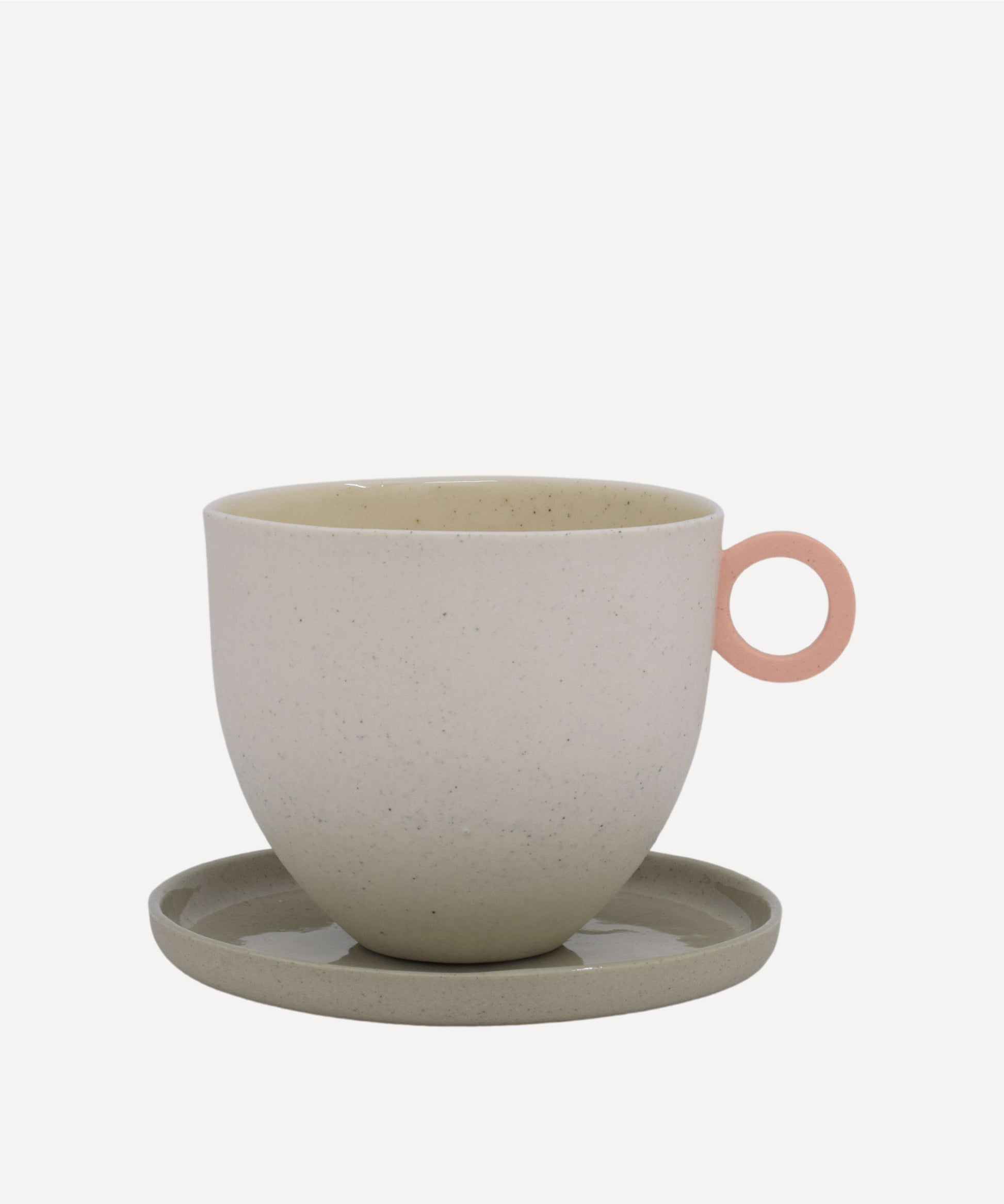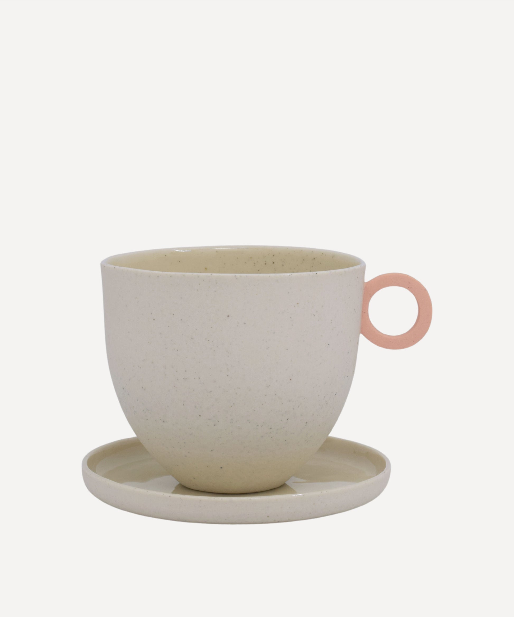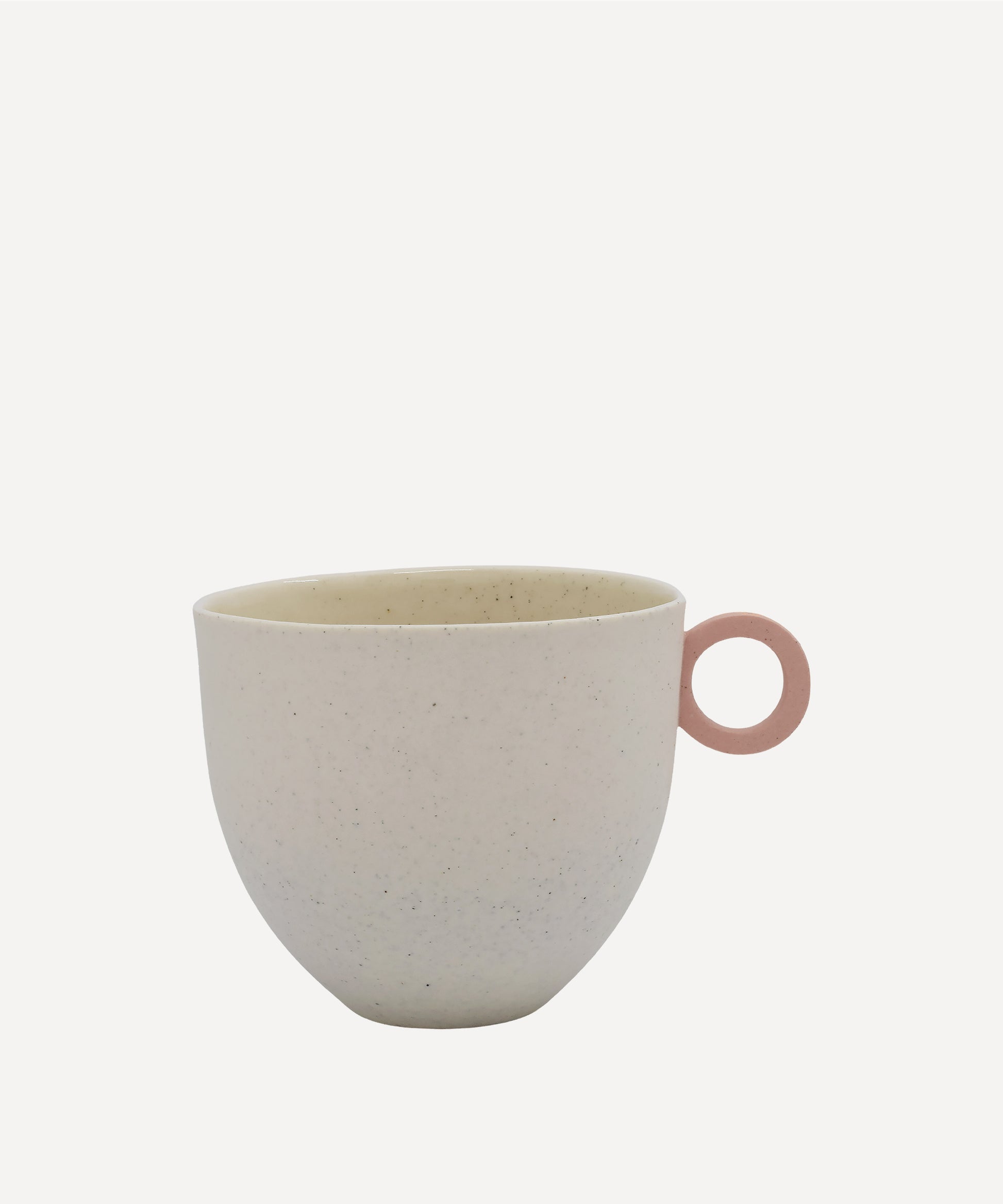The mug has been slip cast with slip containing iron which creates a beautiful speckle throughout. The outside of the mug has a smooth matt finish in contrast to a glossy inside, where a clear glaze has been applied for functionality.
