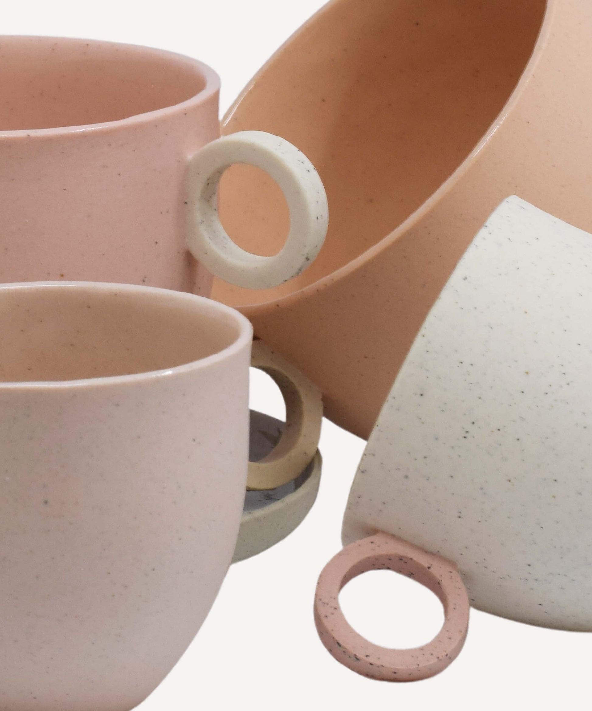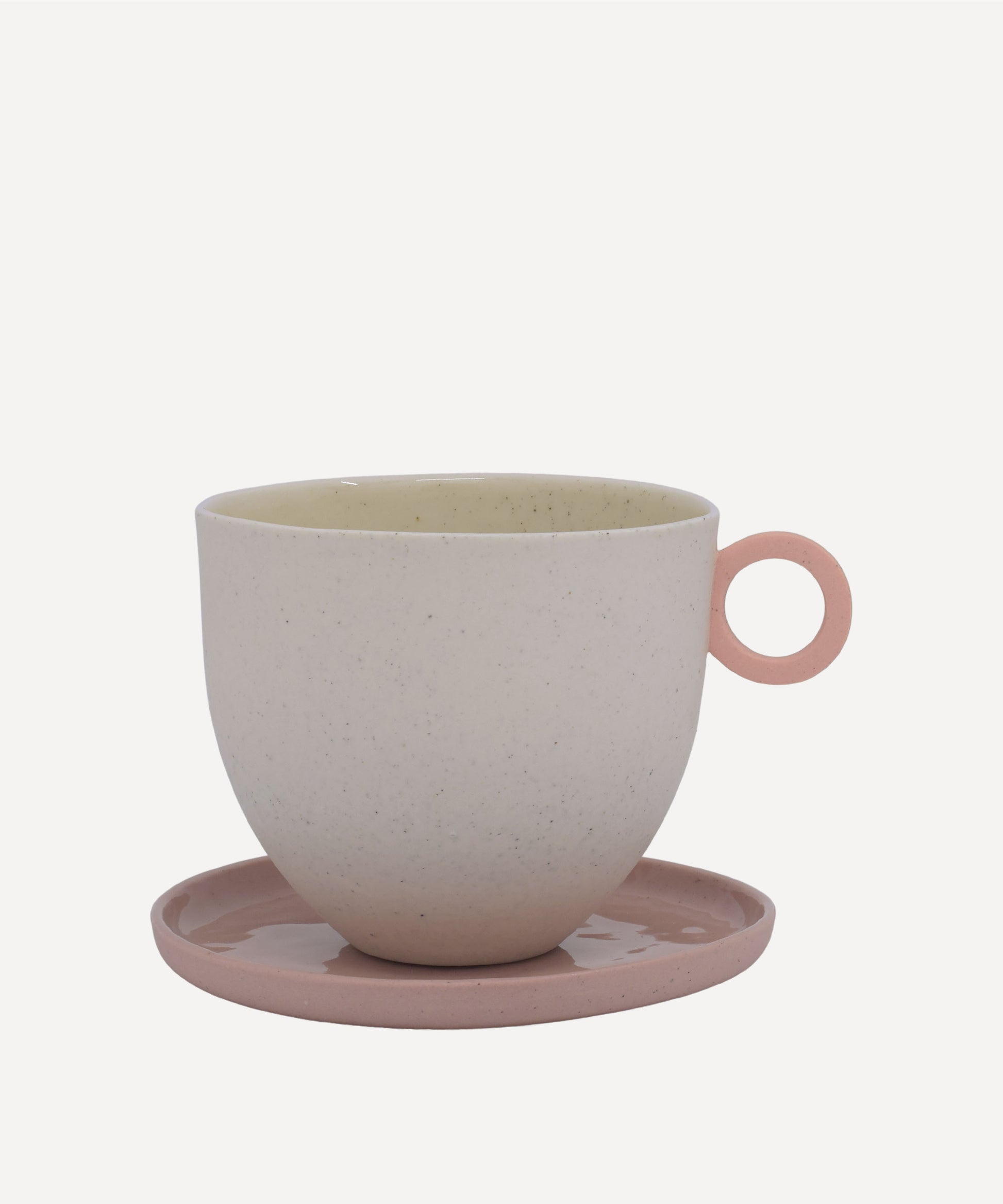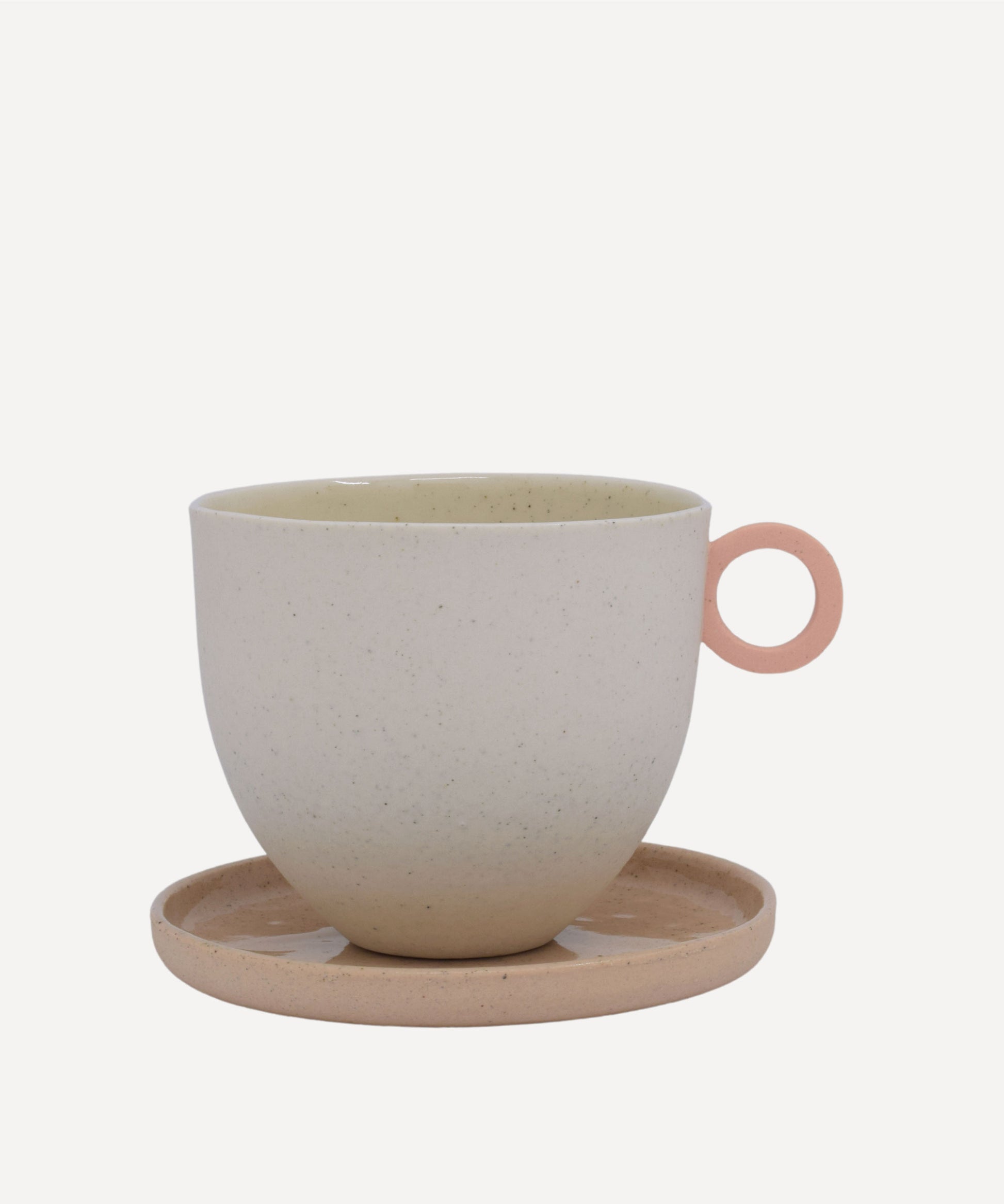 The mug has been slip cast with slip containing iron which creates a beautiful speckle throughout. The outside of the mug has a smooth matt finish in contrast to a glossy inside, where a clear glaze has been applied for functionality.