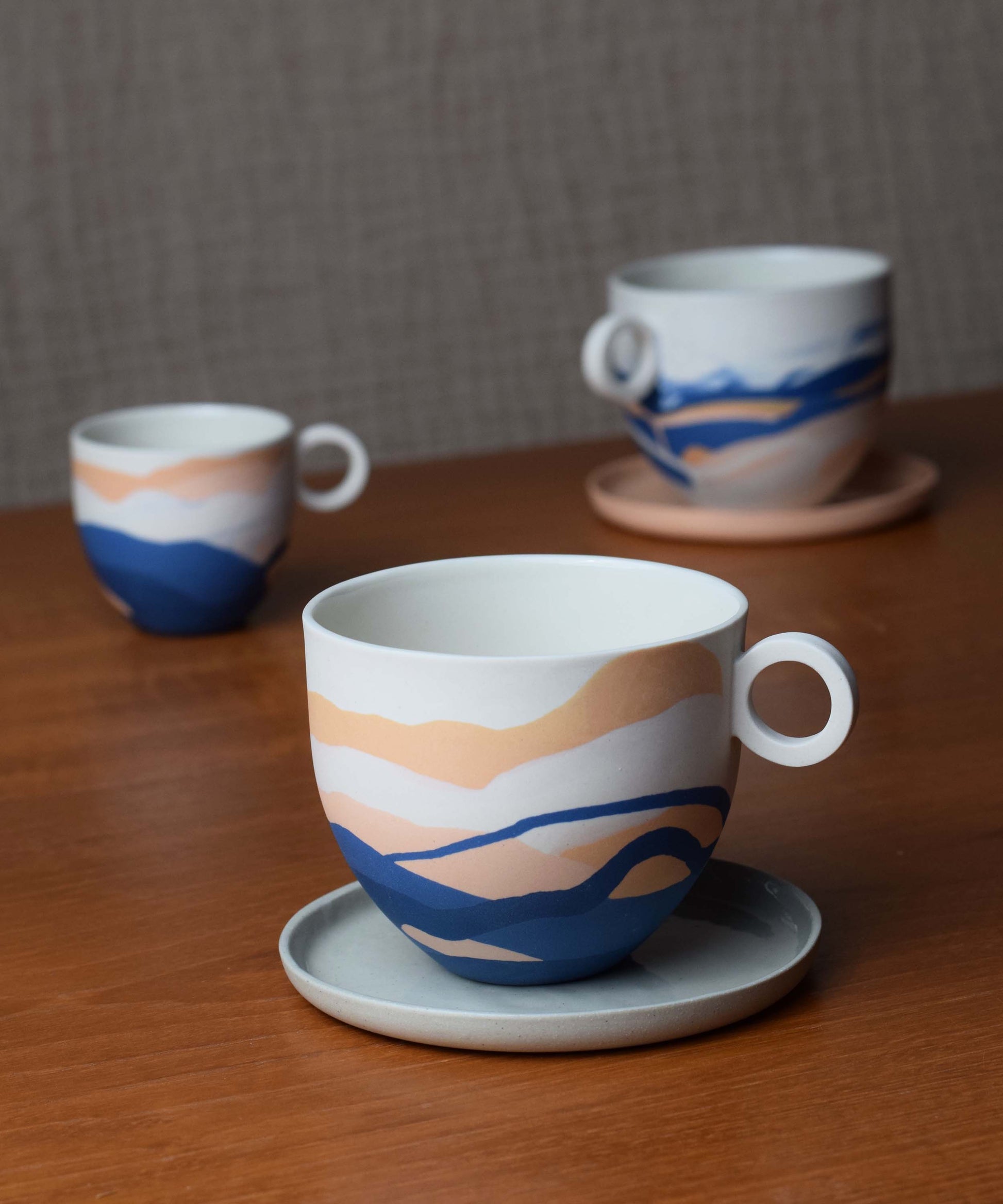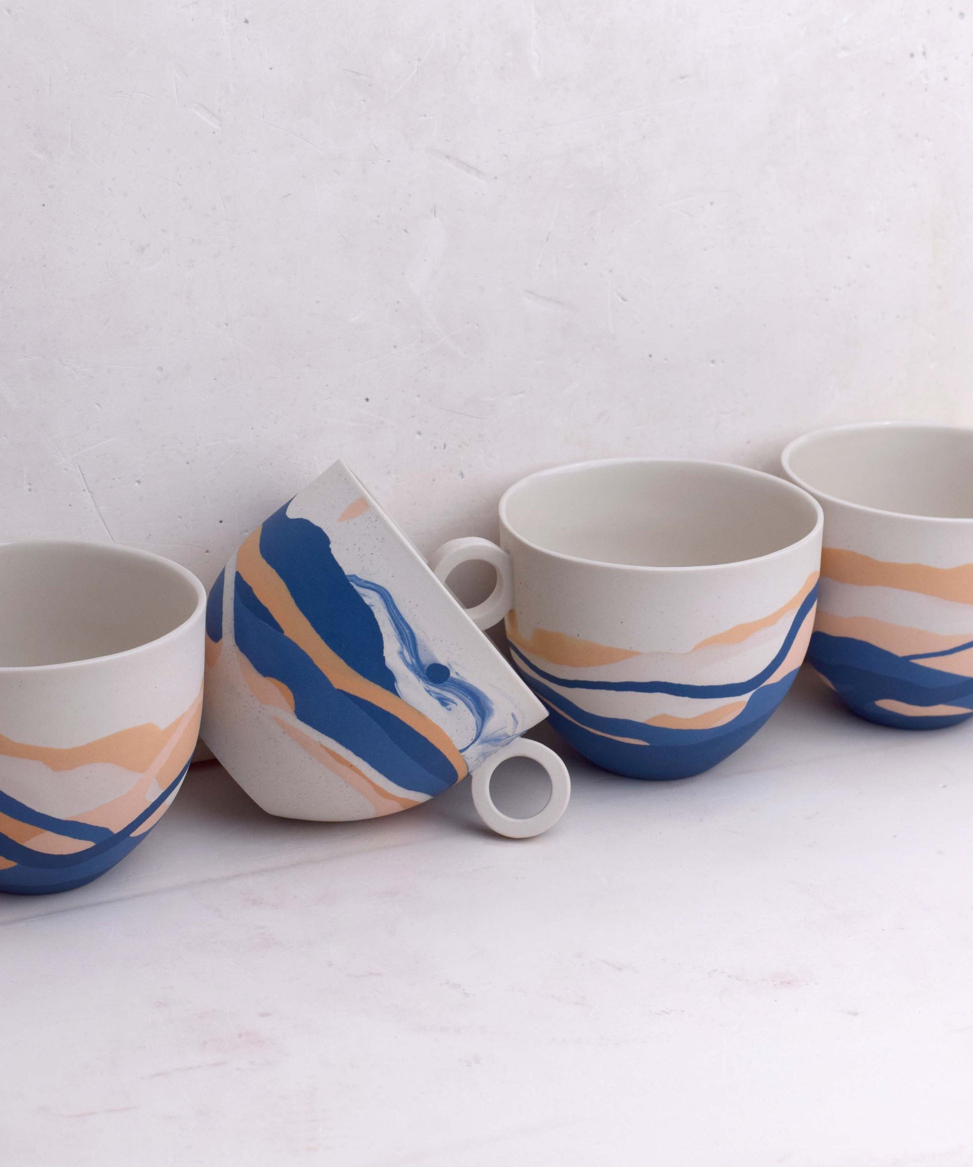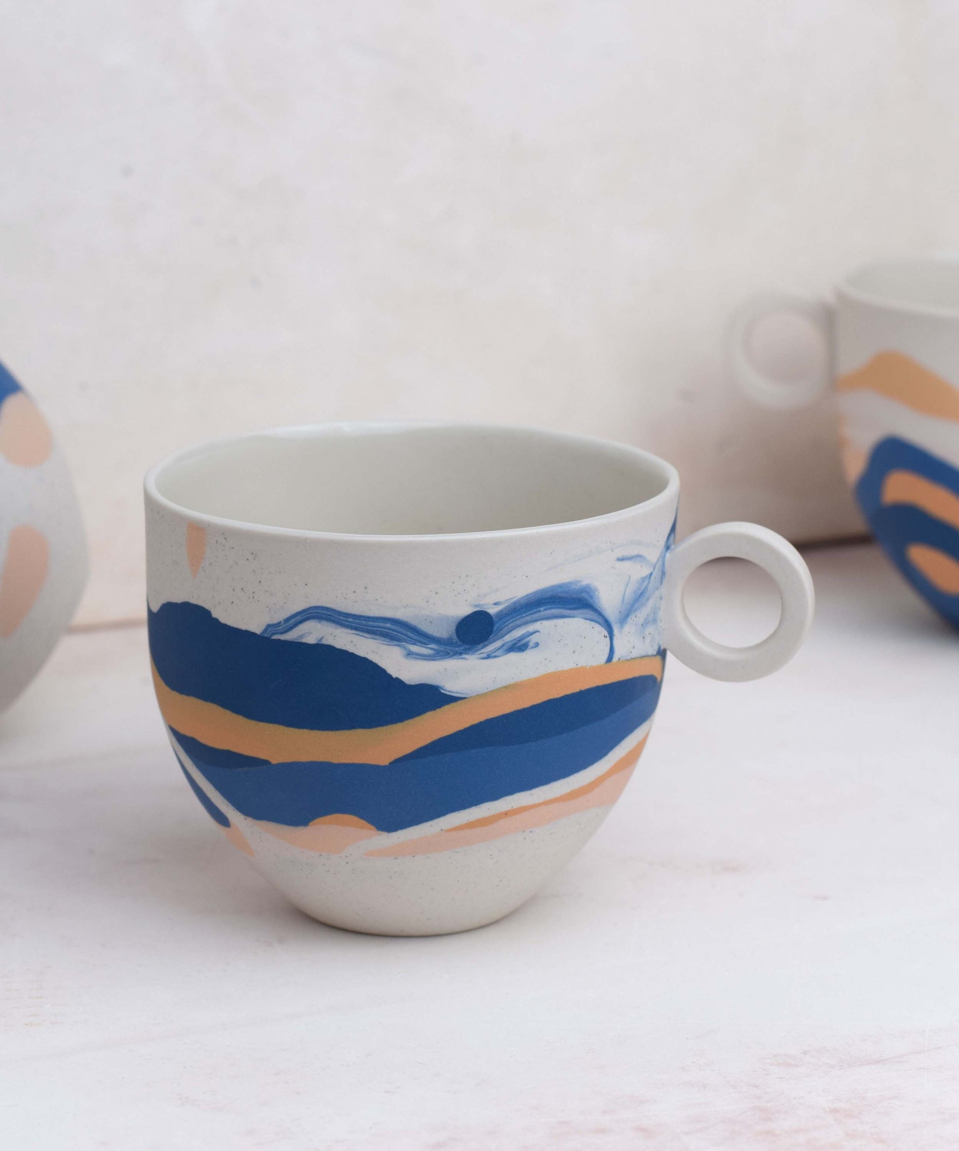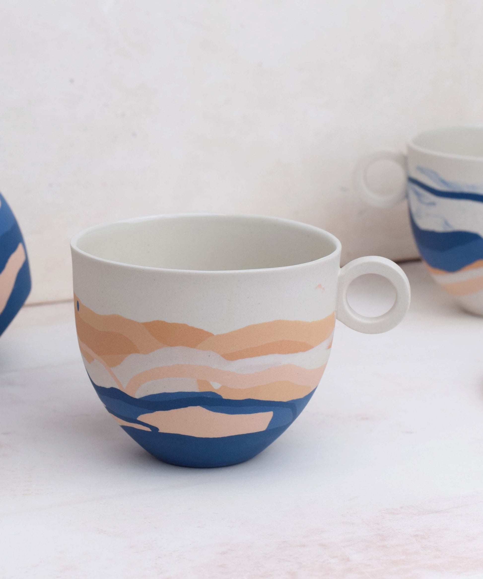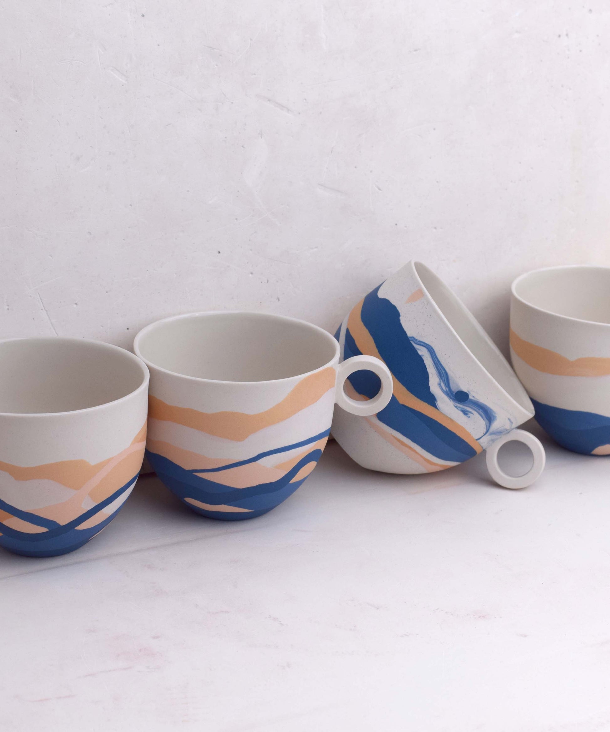 The mugs featured in the photographs represent the style. Due to the making process, each piece is individual and the shades of colours may vary slightly. Each piece is unique and can not be duplicated therefore a mug will be randomly selected from the edition and sent to you.