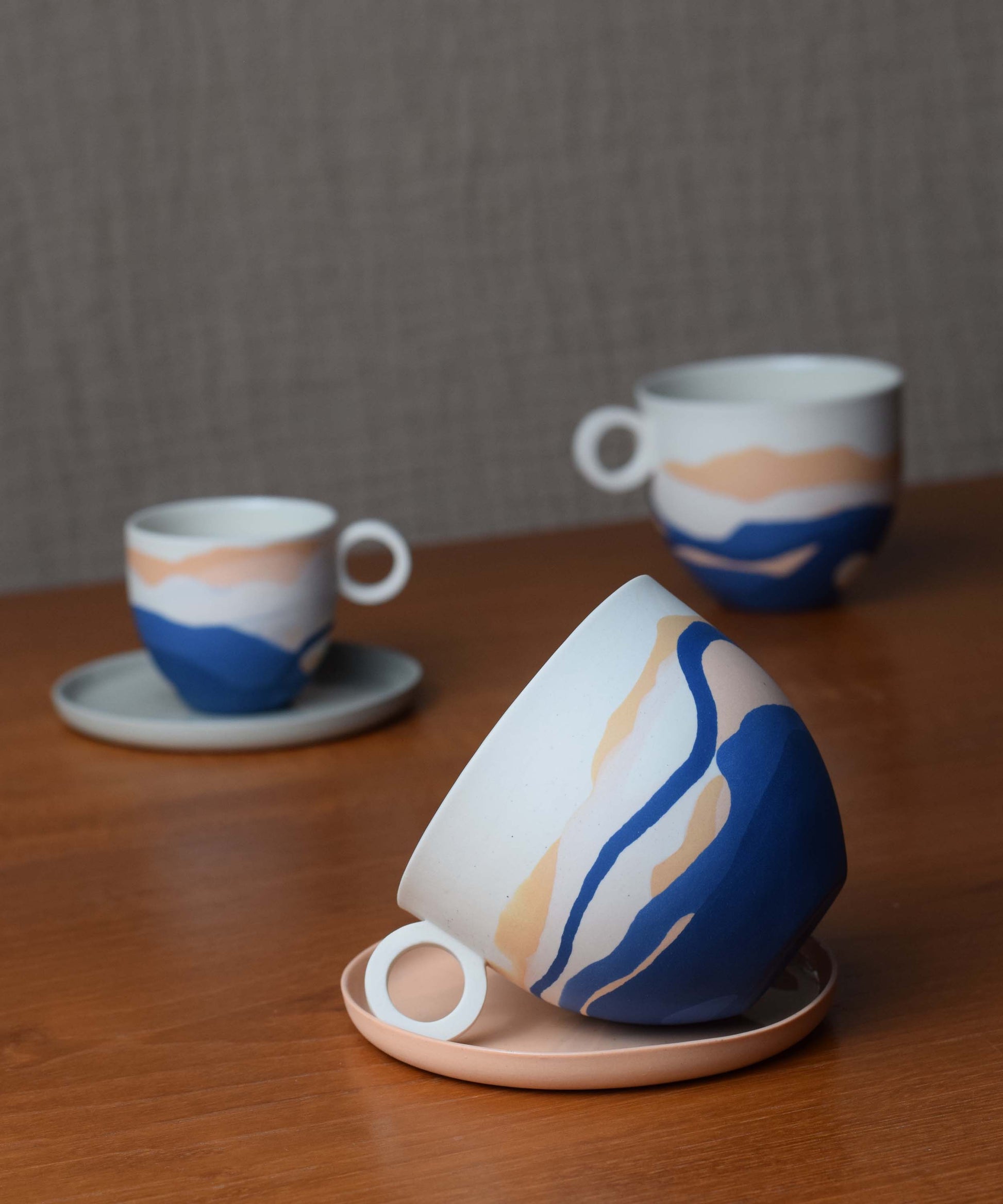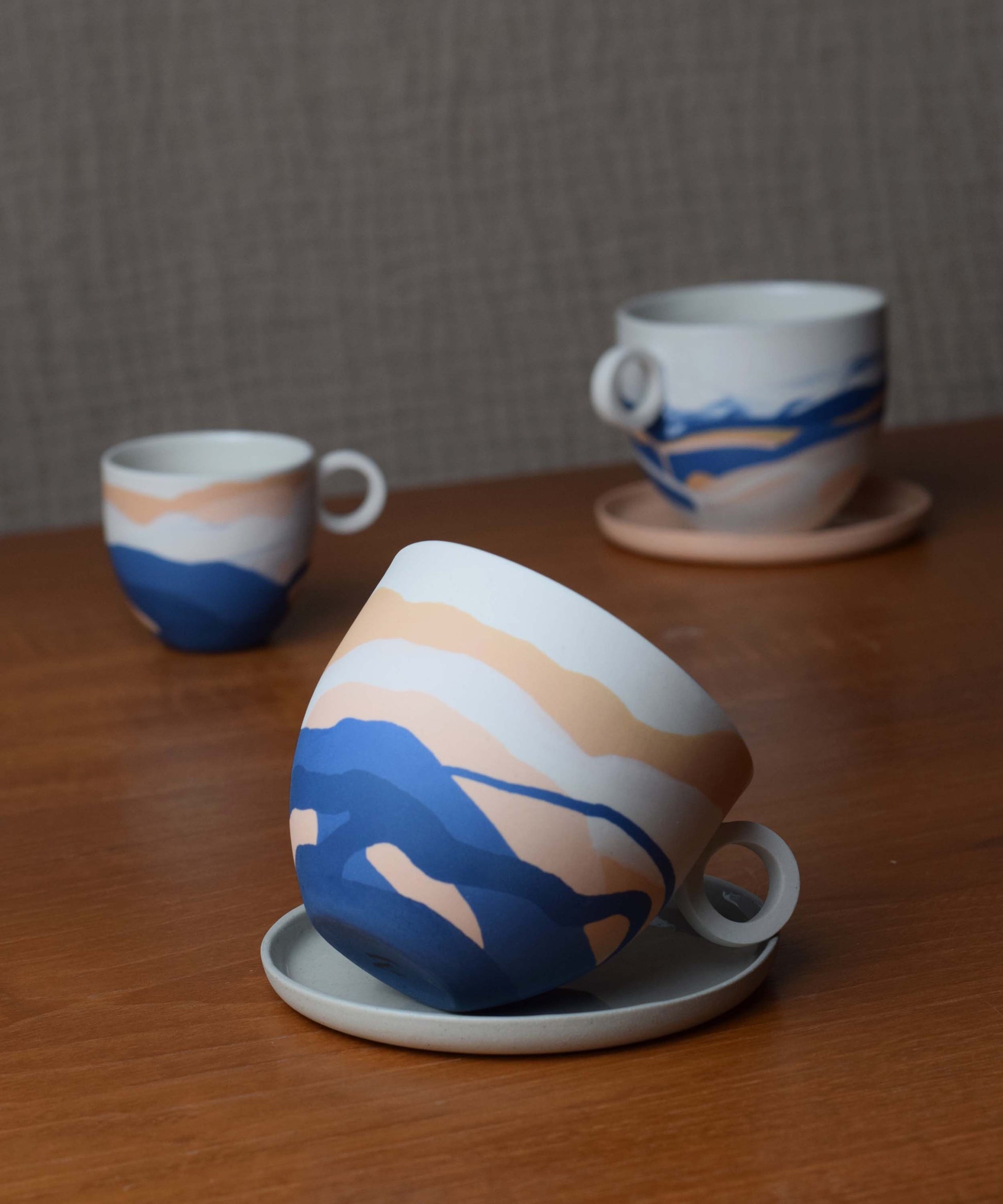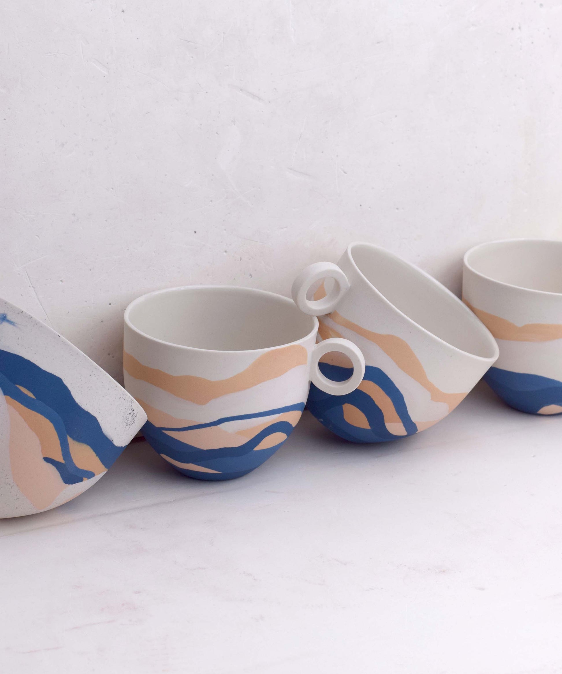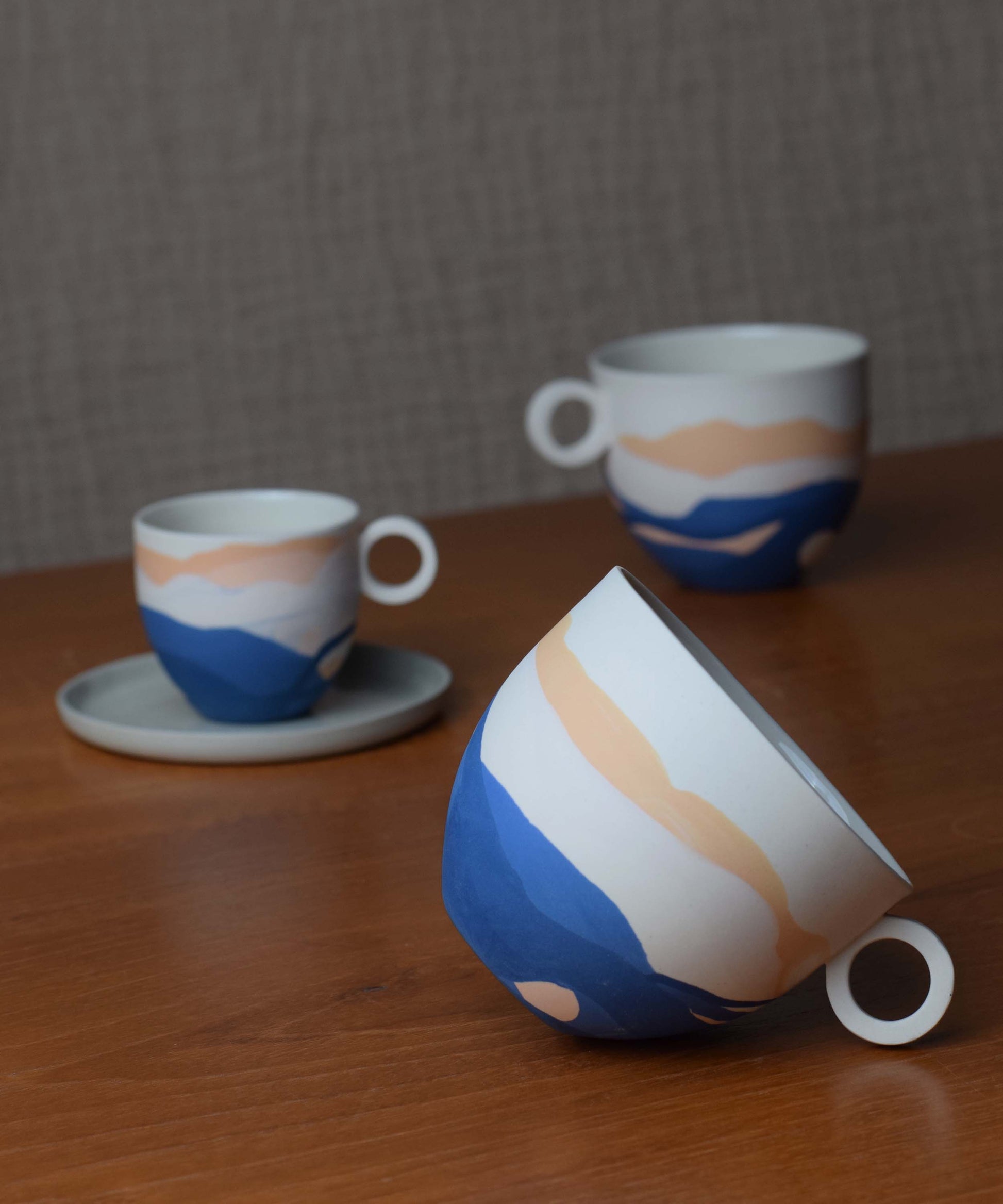Each piece has distinct markings, ensuring it is truly one-of-a-kind. Created in small batches, the colours are skilfully composed from recycled porcelain clay remnants. This waste clay, a by-product of slip casting, has been thoughtfully collected and repurposed in these innovative designs, promoting sustainability and reducing waste.