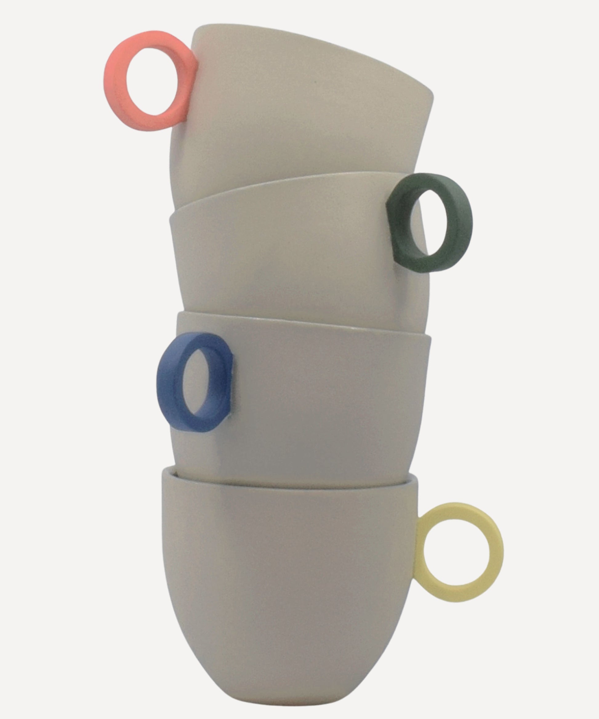 The collection has been slip-cast with a slip that has been stained with ceramic pigment to create colour throughout the piece. The outside of the cup has a smooth matte finish in contrast to a glossy inside, where a clear glaze has been applied for functionality.