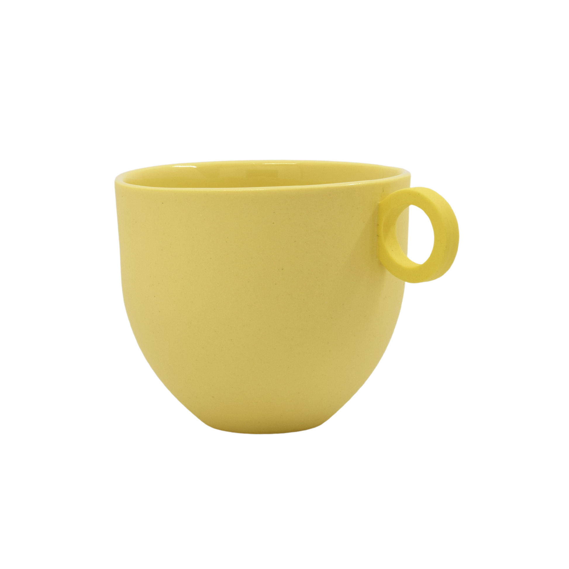 The mug has been slip-cast with a slip that has been stained with ceramic pigment to create colour throughout the piece. The outside of the mug has a smooth matt finish in contrast to a glossy inside, where a clear glaze has been applied for functionality. This is a handmade item and each mug has its nuances, some are completely round whilst others are slightly more oval.